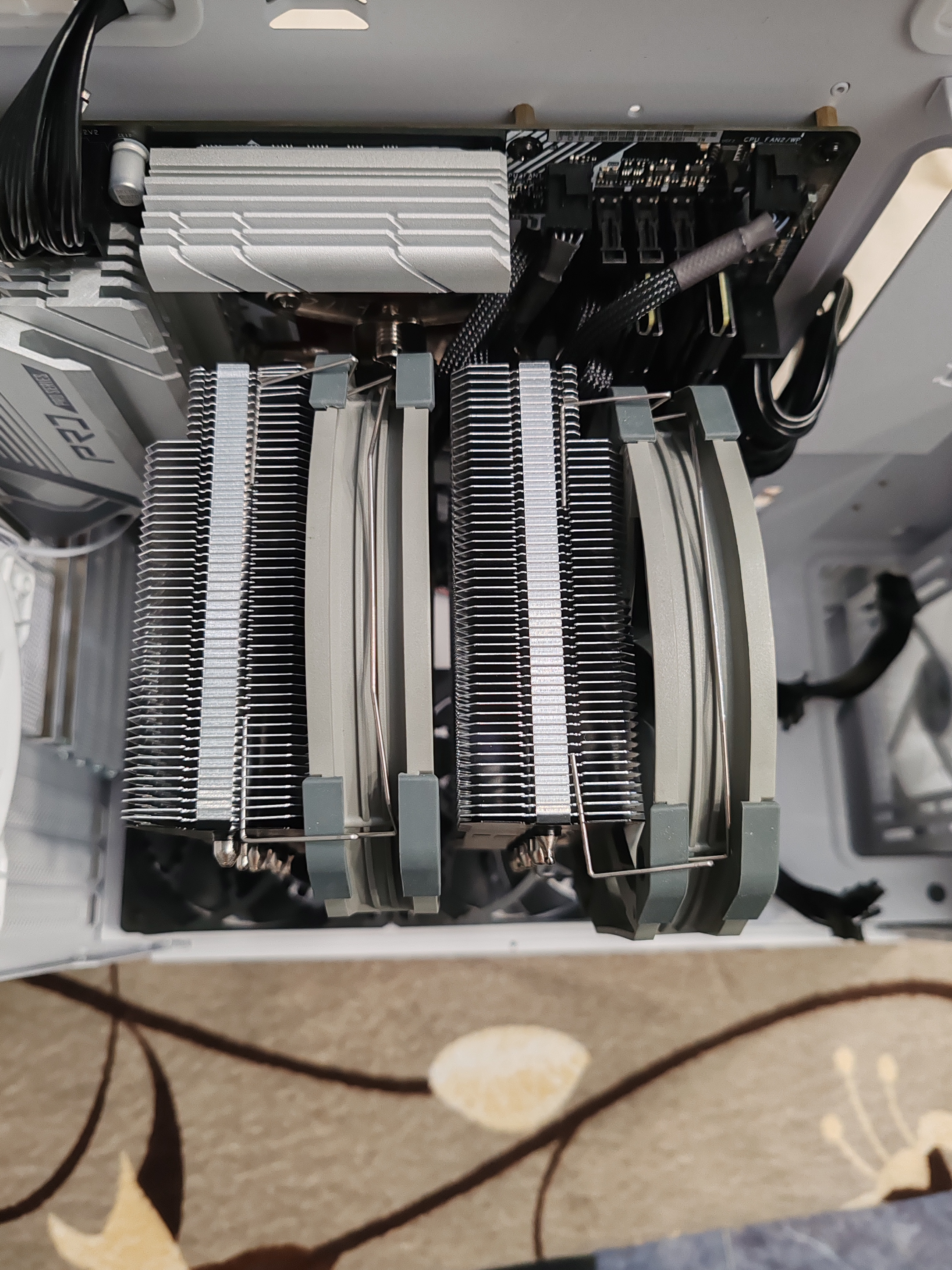 Вентили заметно крупнее радиков, значительная часть потока явно идет мимо. Сверху вообще на 25мм выпирают, т.е. кулек в таком виде уже под 180мм, но у меня корпус позволяет все 190мм смонтировать. По температурам на одинаковых оборотах (800 и 1000) разница с комплектными на уровне погрешности (никаких ожидаемых -10С, как на ih-4700), но TL-014,несмотря на габариты, заметно тише, а уж на максимальных 1500об у TL-014 и 1650об у родных 12см разница просто колоссальная. Кроме того, мать в авто режиме докидывает процу до 100Вт потребления вместо максимальных 82Вт ранее, что выливается в +100баллов в сайнбенче23 (15150 против 15050 на 1000об) и видимо в этом заключается отсутствие разницы в температурах. Возможно более крупные вентили дают лучший обдув околосокетного пространства.