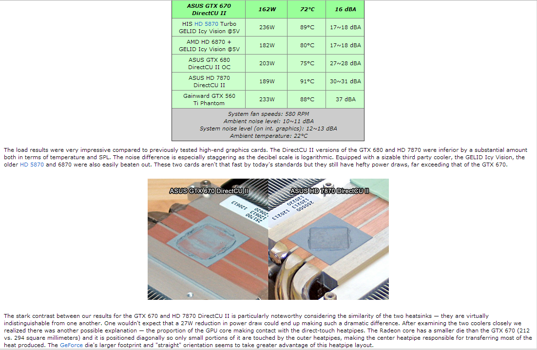 -------- MummyYo ой-ой-ой. При чём тут видеочипы, когда там одна трубка закрывает 60-70% кристалла и её вполне хватает для переноса тепла.... Ерунда. Хватало бы одной - не лепили бы три. ))) Вы в курсе, что TDP 670ки аккурат в 2 раза больше i5? Если ей хватает одной, то какие вообще разговоры могут быть за тишину и КПД башенных кулеров... Что касается размера кристала, то 294 квадратных мм у 670ки и 177 mm² у 4670. Опять почти 2-кратная разница у GPU. Где же он, чудо кулер с одной 10мм тепловой трубкой ))) На деле же Асус поворачивает и так и сяк. 7870 помельче, там наискосок трубку кинули (точнее процессор, трубка в СО так же расположена). А 670 поболе, там поперек, чтобы захватить трубками оба края. В итоге 7870 с ее 212мм гораздо громче, хотя всего на 27 ватт теплее. А вы говорите одной трубки хватает! Заканчивая оффтоп с картами... По-моему радеон стал жертвой унификации и, брось Асус чип по двум трубкам, темпы/шум были бы куда лучше...