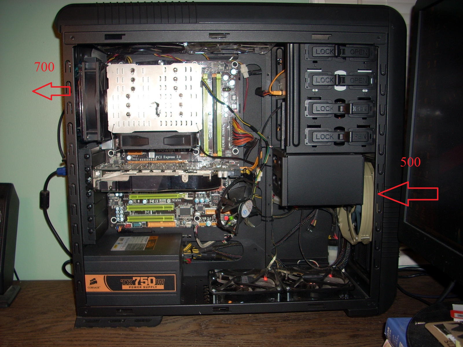 Если бы не видеокарта, можно было бы говорить о такой возможности... я бы на передок ставил 700, а на задок 500 - чтобы позитивное давление было и меньше пыли тянуло. хотя обороты небольшие, можно и так. только непонятно чего выхлоп не в крыше. по-хорошему надо делать пуш пул - 350-700 продувают башню, 700 от нее же тянут. а тут пересечение потоков. хотя наверное циркуляция потоков это оффтоп в данной теме... ... или это не ваш корпус? какая то фигулина на кишках болтается у карты. и 2 вертушки в полу...