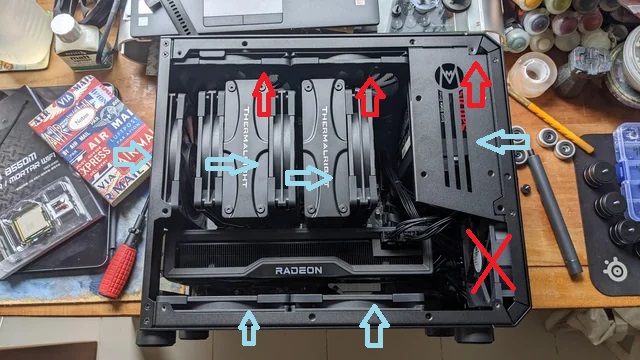 Будет примерно сборка с такой организацией охлаждения. Не будет ли средний вентиль (140) у Frost Commander обдувать память тгорячим воздухом. Могут ли быть из-за этого проблемы? Память с небольшими радиаторами на 1.35В.