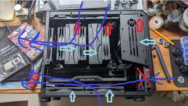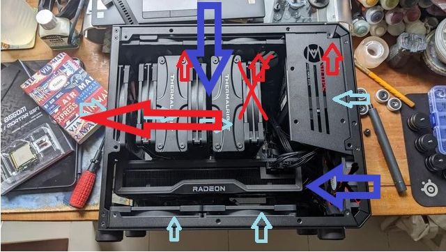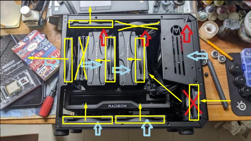 Спасибо конечно за схемы! Но у меня есть define s (еще тот гроб) с классической схемой охлаждения. Мне интересно сделать именно так как я нарисовал (корпус jonsbo d31). Просто не понятно как будет чувствовать себя память имено с кулерами типа Frost Spirit/Frost Commander, ведь по классичекой схеме средний вент обдувает около сокетное пр-во и врм, а при реверсе он будет дуть на память.