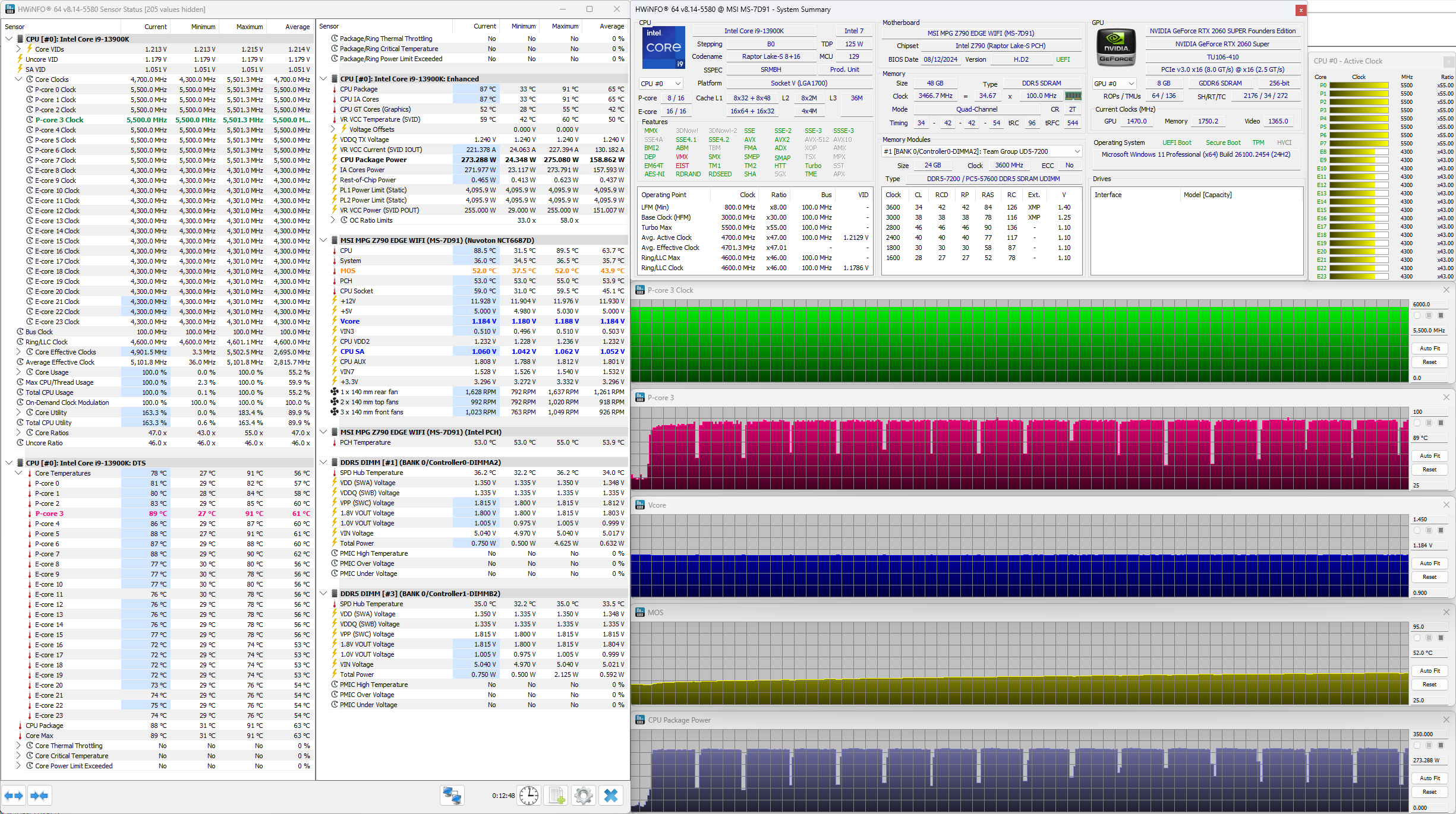 По данным HWiNFO64 это 275 ватт в пике при 91 градусах Цельсия по самому горячему P-ядру. Если дальше скорость вентиляторов кулера снижать, то троттлинг.