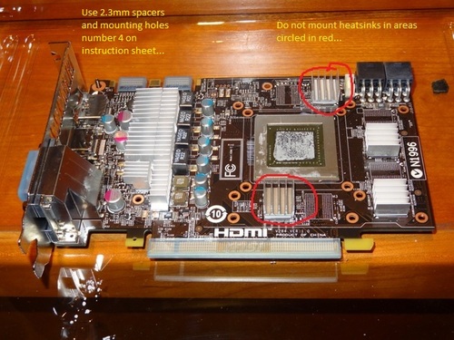 Попробуйте сделать примерку кулера на видеокарту с установленными, но не приклеенными радиками.