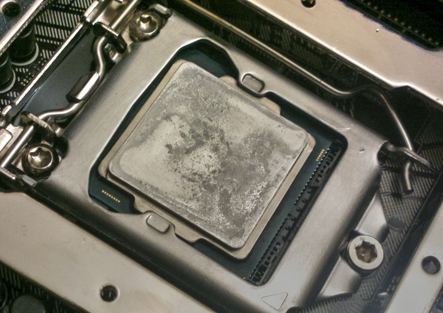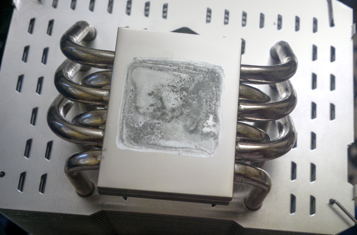 Добавлено спустя 9 минут 21 секунду: Может, заодно здесь напишу, а то тема "ЖМ как термоинтерфейс" слишком мёртвая. Чуть больше месяца назад я нанёс CL Pro между основанием кулера и крышкой процессора, хорошо обезжирив и "залудив" обе поверхности. Стало холоднее примерно на 2 градуса по сравнению с MX-4. Вроде бы мелочь, но примерно та же разница между гудением на полных оборотах и относительной тишиной... Понадобилось сменить проц. Откручиваю два винта с крепёжной пластиной, качаю радиатор... опа, уже успело приклеиться, не оторвать. Тогда взял широкую отвёртку и подлез ею между поверхностями. Раздался ЧПОК! - и что же я вижу?