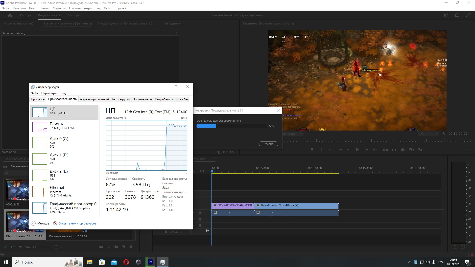 Это всего-лишь сборка видео с одновременным апскейлом из 720р в 1080р - 12400 не прогрелся выше 36-38С, да и видеокарта не прогрелась выше 38С.