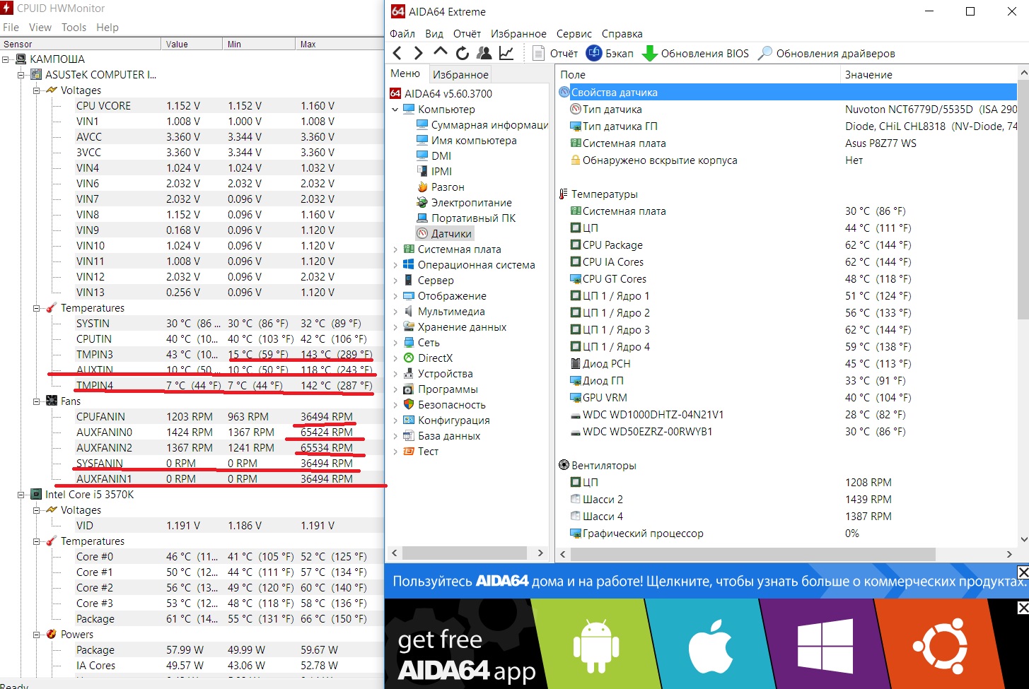 Самые "правдоподобные" программы мониторинга обычно от МП - причём версия которая из коробки. Из этих 2-х аида обычно более правдоподобна. И если например по температурам ЦП можно узнать его Tjmax и настроить правильно в некоторых программах. То по остальным... это как к гадалке ходить. Да и вообще неизвестно где и какаю температуру вам отображают, где физически стоит этот датчик
