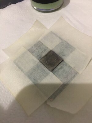 После успешной замены одного листа на другой и очисткой поверхности теплораспределительной крышки процессора от возможного налёта графита с помощью бензина "Калоша" (нефрас С2-80/120), а затем изопропиловым спиртом (99,7%) был приклеен лист новой термопрокладки. Сама термопрокладка чисто визуально выглядит толстоватой, хотя толщина всего половина миллиметра. Не смотря на то, что по data sheet'у того же PGS характеристики графита улучшаются из-за сжатия, есть сомнения в том, что показатели улучшатся.