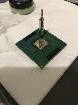 Сначала решил попробовать на кристалле CPU. Для этого я у себя нашёл старенький Intel Pentium 4 3000E. Данный процессор я скальпировал когда-то давно чисто ради интереса. Как конкретно я это делал уже не вспомню (вроде в тисках), но он даже работал после этого.