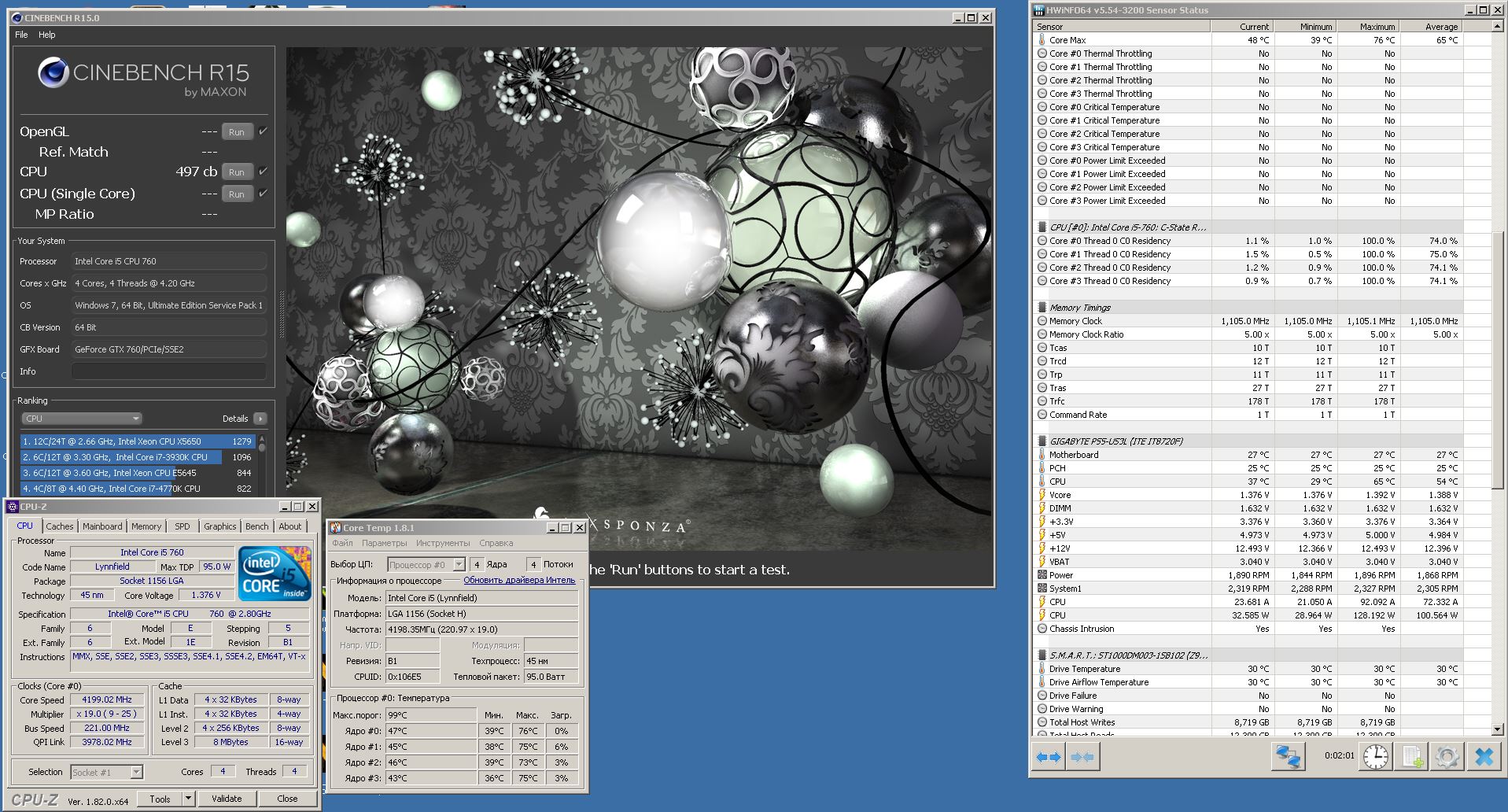 Привет i5 760 без скальпа разогнан 4.2 при 1.4v в биосе. Без нагрузки в винде 1.36v. Под нагрузкой 1.39v. плата Gigabyte ga-p55-us3l. Открытый стенд. Deep cool capitan 240 ex white - помпа на максимальных оборотах, два вентиля тоже, прижим нормальный. Дополнительно обдувал радиаторы и пространство вокруг сокета. Паста gd900. Максимальная темпа по ядру после одного прохода cinebench 15- 76гр