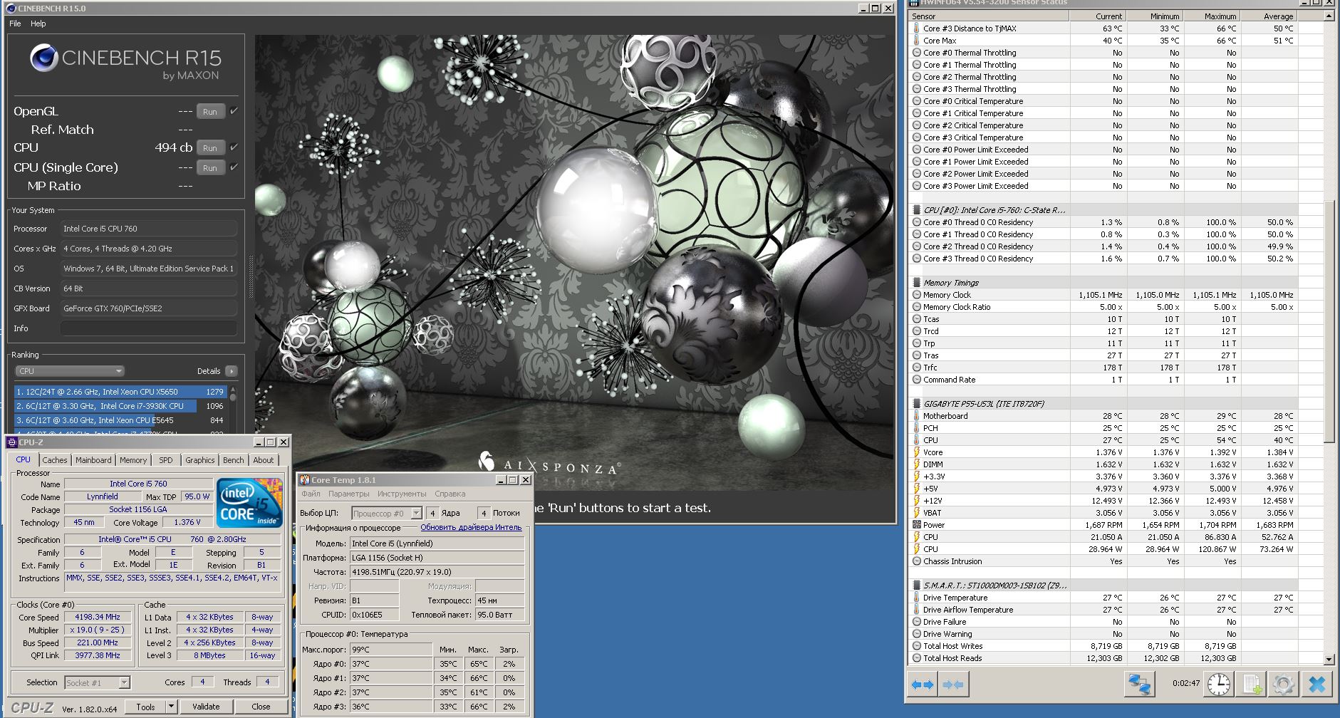 Ice hammer ih-4700 - кое-как выровненная подошва на зеркале. обороты одного вентиля ~ 1600. Ничего воокруг сокета не обдувалось дополнительно. Темпа - 66гр. (результат отличается из-за кое-какой проги, висячей в трее)