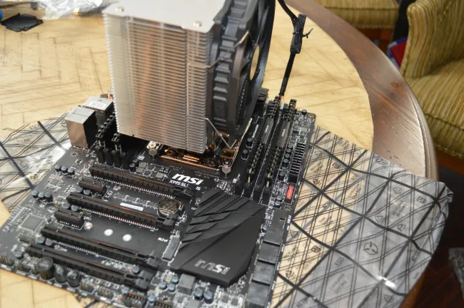 На данную мать не встанет обычным способом-будет перекрывать слот pci-e.Если материнка формата mATX то брать кулеры со смещенным радиатором вверх (Архон,NH-D15s и подобные) или со 120мм вентиляторами. Я бы в сторону Мюгена 5 или Ниндзя 4 смотрел.
