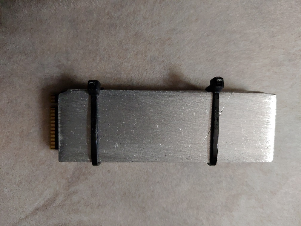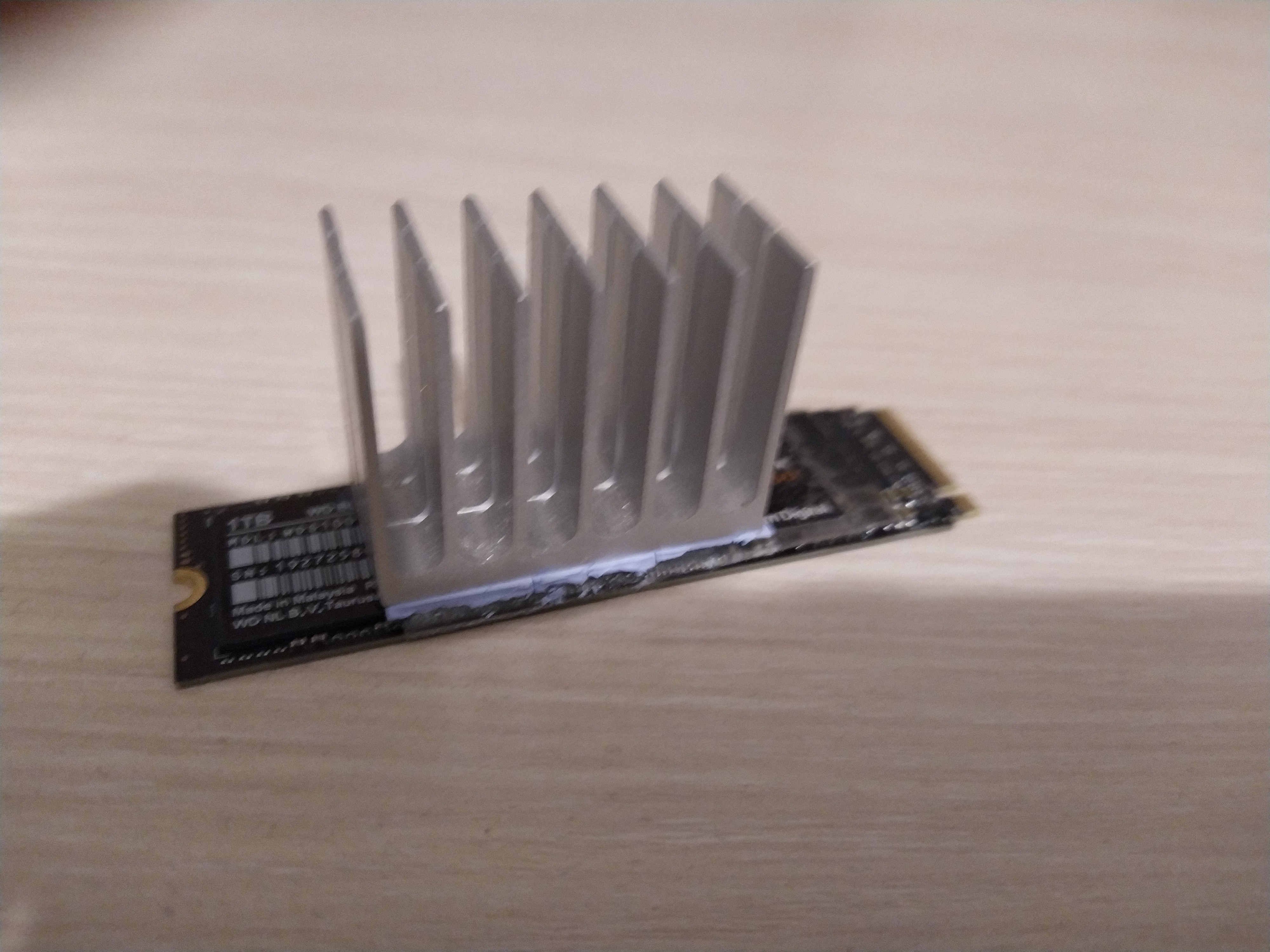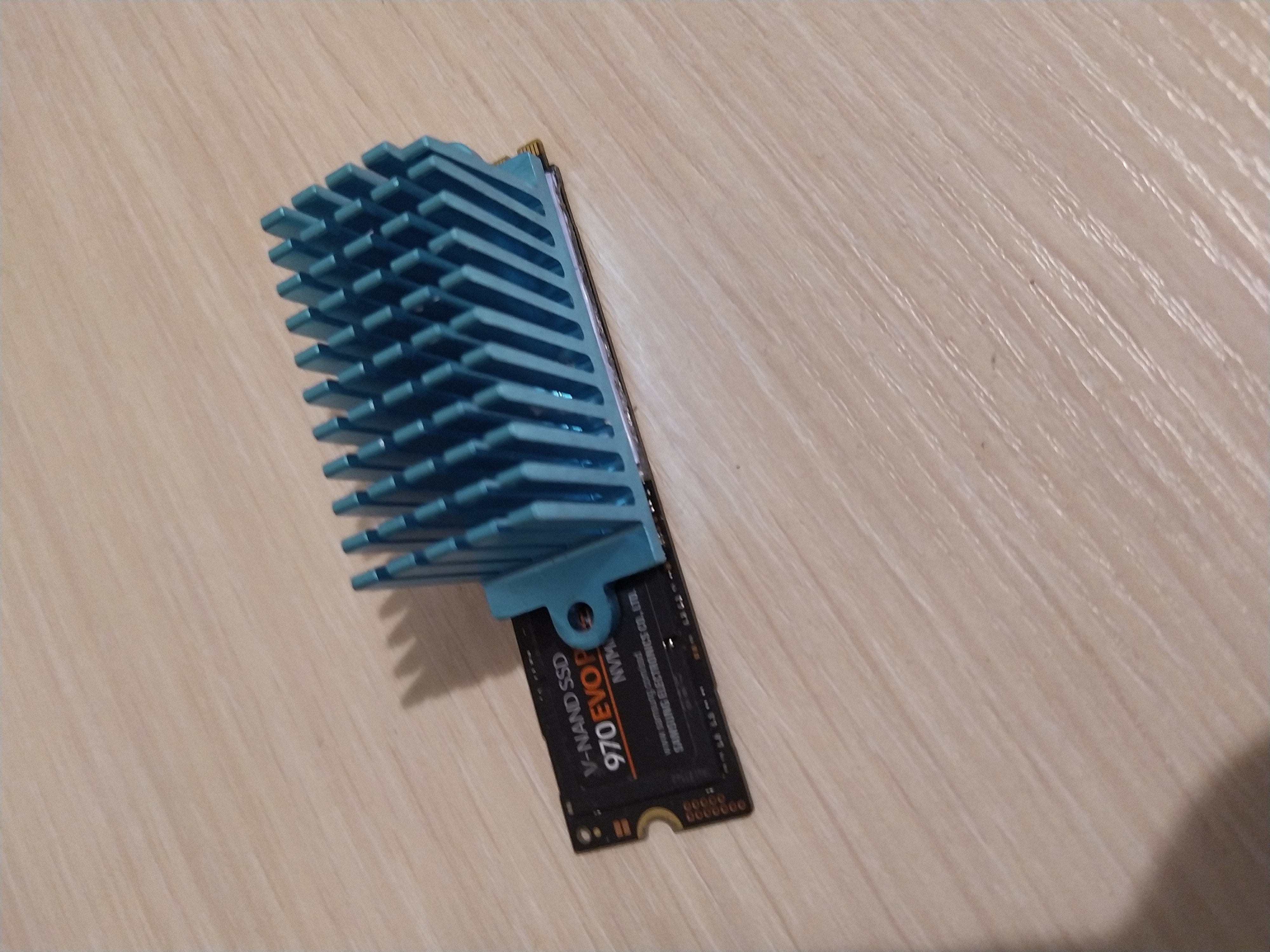 Сегодня поставил на Samsung 970 Evo+ вырезанный алюминиевый брусок(из AMG6-марка стали), размером 80Х22Х8мм прямо на наклейку. Капнул МХ4, там где зазоры образовались и стянул всё это дело нейлоновыми стяжками. Главное стяжки делать аккуратнее,на двух точках соприкосновения памяти и контроллера с радиатором. Чипы памяти толще контроллера, перекос получается и можно текстолит погнуть(он очень тонкий), или вообще пайку чипов оторвать. В результате получил 47 градусов память и 52 градуса контроллер. Без радиатора температура была под нагрузкой 65 градусов память и 85ть контроллер. Как-то так... До этого был ADATA SX8000NP 240GB, который уходил в троттлинг при 60ти градусах. Такая же конструкция не давала ему разогреваться выше 50ти градусов, чего вполне было достаточно для нормальной работы. З.Ы. Со стороны это выглядит колхозом, но главное со своей задачей справляется, а в корпусе не видно вообще. Ну и стоило это мне 0рублей и 0копеек.)