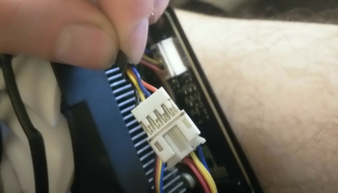 Здравствуйте. Есть видеокарта asus gtx 780 directcu2 с установленным охлаждением Arctic xtream 3. Проблема в том что в работе карта не может регулировать обороты автоматически и вручную, а также тахометр показывает 0. Вероятно всего неправильно подключенны провода от СО к видеокарте. Проблема также в том что у арктика разьем 4 пиновый, а у видеокарты 5 пин. Зеленый провод идущий от разьема карты был обрезан, а остальные провода подключенны как на фото. Подскажите как правильно подсоеденить провода что бы все заработало, если еще ничего не сгорело.