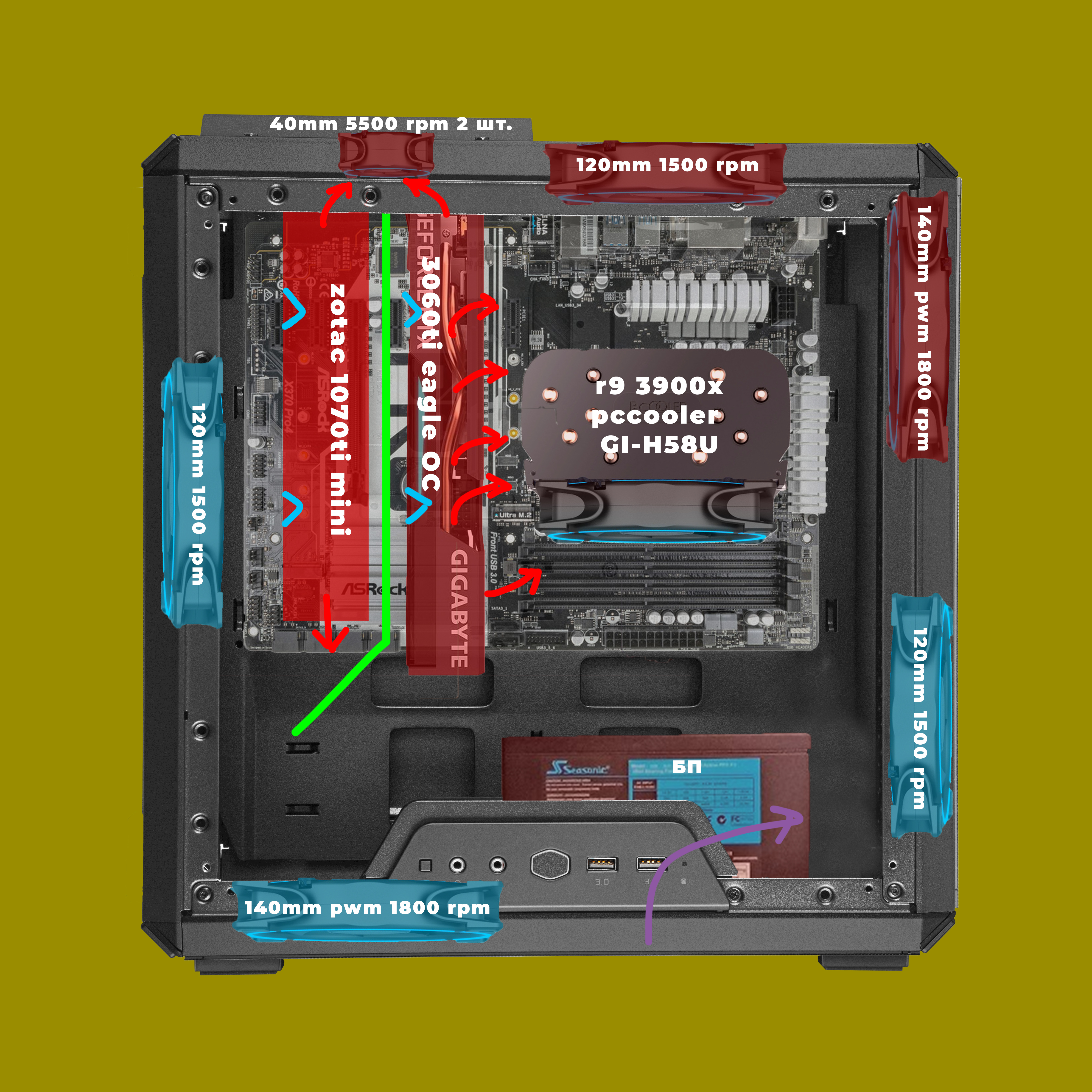 Нарисовал схему: - синие вентиляторы вдувают, красные выдувают - размеры и пропорции старался соблюсти - зеленая линия, собираюсь делать пластиковую перегородку шириной с видеокарту, чтобы горячий воздух из 1070 не шел напрямик в 3060, насчёт неё как раз сомнения - стрелками на ВК и БП показал вдув и выдув воздуха.