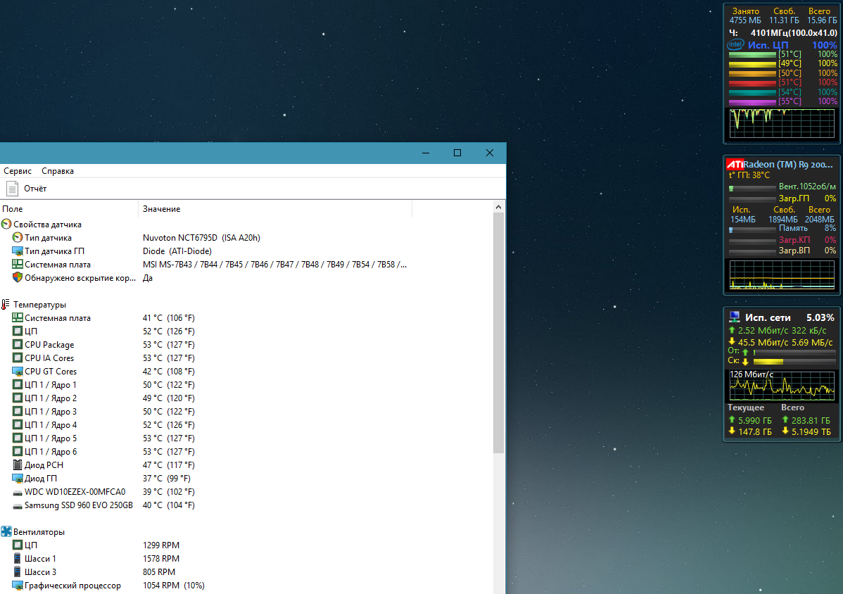 Месяц назад были отличные: 28-32 в простое, в играх до 45, под более серьезными нагрузками до 50 даже в нищенском корпусе с 1 вентилем на выдув. Сегодня за окном +30, и это сказывается. Пока больше 57 не видел при загрузке камня до 90%. Так прикинул, у меня этот кулер за 4 года открутил 11 000 000 оборотов без замены вертушки. И только недавно начал тарахтеть.