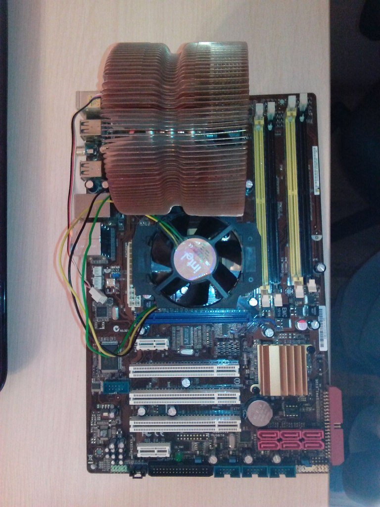 Материнская плата Asus P5Q SE2, радиатор на северном мосту не ахти какой, все жалуются, что мост греется и решил туда вентиль поставить (взял с рук по дешевке для Ксеона, так что еще сам не тестировал еще). В руках был какой-то карлсон с оооочень старого компа, взял в руки пилку, подрехтовал в определенных местах, нашел 2 полоски алюминия, вставил в корпус вентилятора, и посадил прямо в ребра радиатора. Посадка была с небольшим натягом, никуда деться не должно)