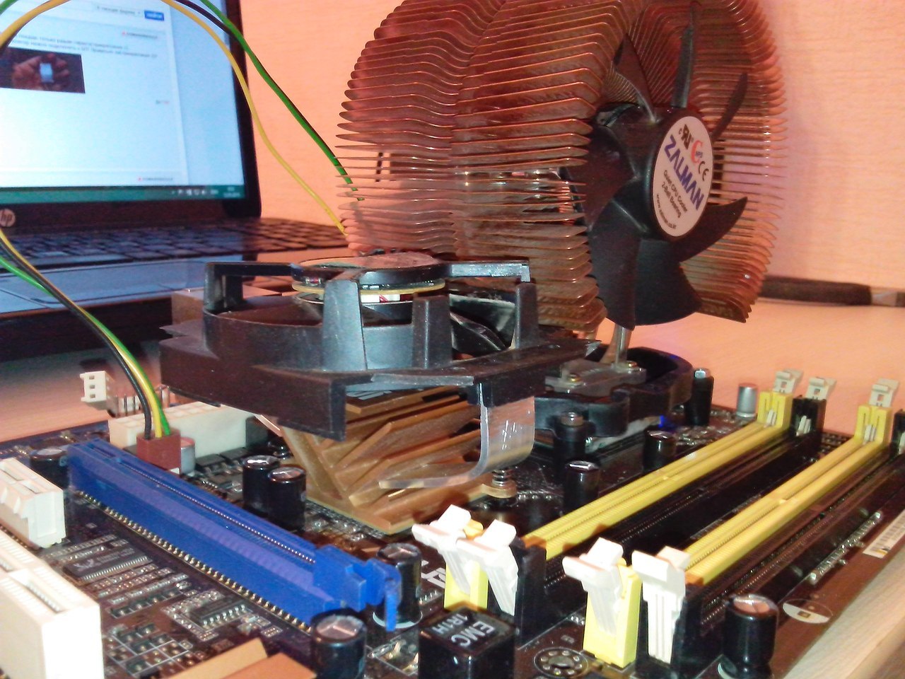 Материнка P7N SLI. Северный мост дичайшим образом греется (пары секунд палец не держит, сильно обжигает), доходит аж до зависания ПК. Нашел на балконе какого-то динозавра, снял с процессорного кулера вентилляторчик 50х50х15мм. Саморезы в радиатор моста не вкрутишь. Термоклеем надежно будет? Хотел на радиатор северника полностью этот кулерок прицепить, да IFX-14 мешает(