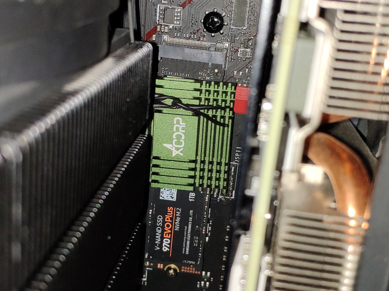 Teller а вот этот выглядит слишком низким. imho лучше край у голубого отпилить. и вообще если ставить так, что ssd будет у горячего проца над горячей видеокартой, то лучше вообще радиатор убрать. он вероятно будет больше тепла собирать, чем отдавать. до троттлинга 970 evo plus вы все равно вне тестов не доведете, а с точки зрения сокрашения диапазона температур ему в том месте без радиатора будет даже легче. на миграции он и без радиатора больше не показал бы. лучше проверьте какая у него будет температура, когда вы в/к разогреете за полчаса игры.