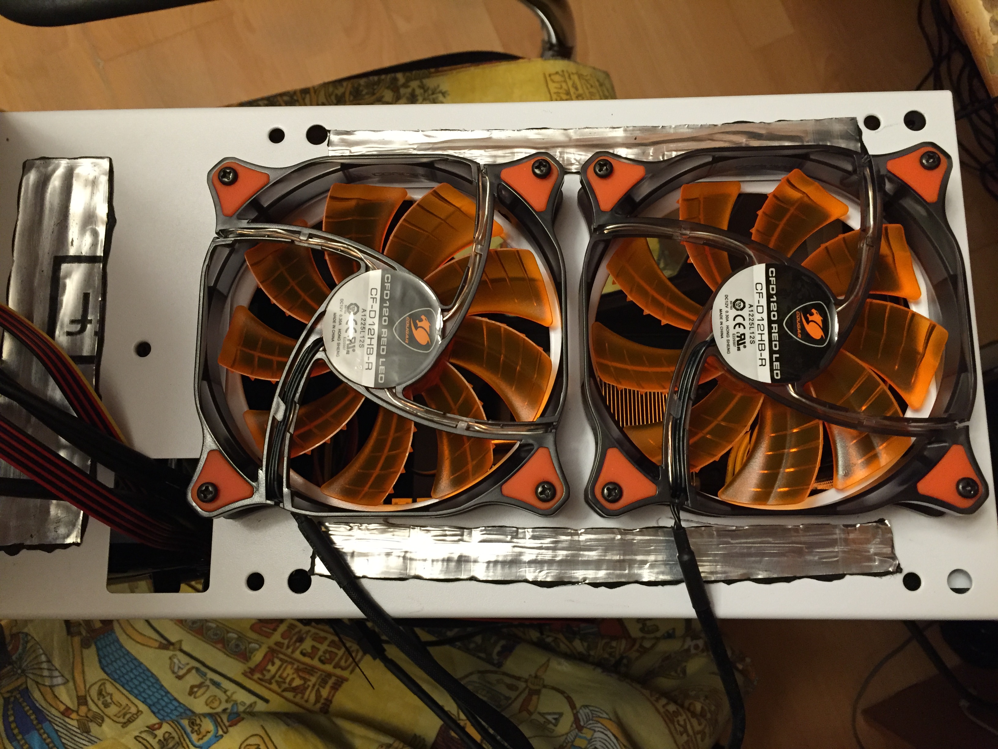 Жесткий диск охлаждает вентилятор - Cougar CF-T12S. 120x120 мм, 3-pin, 1200 об/мин, 17.7 дБ] Чуть выше на вдув холодного воздуха в сторону видеокарты стоит - Arctic Cooling F12 120x120 мм, 3-pin, 1350 об/мин - 1350 об/мин, 24.4 дБ]. Его поток продолжает штатный синий кулер Zalman 1000 об/мин. Еще выше на месте привода или реобаса, стоят 2 не закрепленных, слабых штатных Zalman za1225asl 1000 об/мин На выдув стоял Arctic Cooling F12, но он стал вибрировать и теперь стоит штатный Zalman za1225asl 1000 об/мин На выдув через крышу стоят - 2 Вентилятора Cougar DUAL-X CF-D12HB-R [120x120 мм, 3-pin, 1200 об/мин, красная подсветка, 16.6 дБ].
