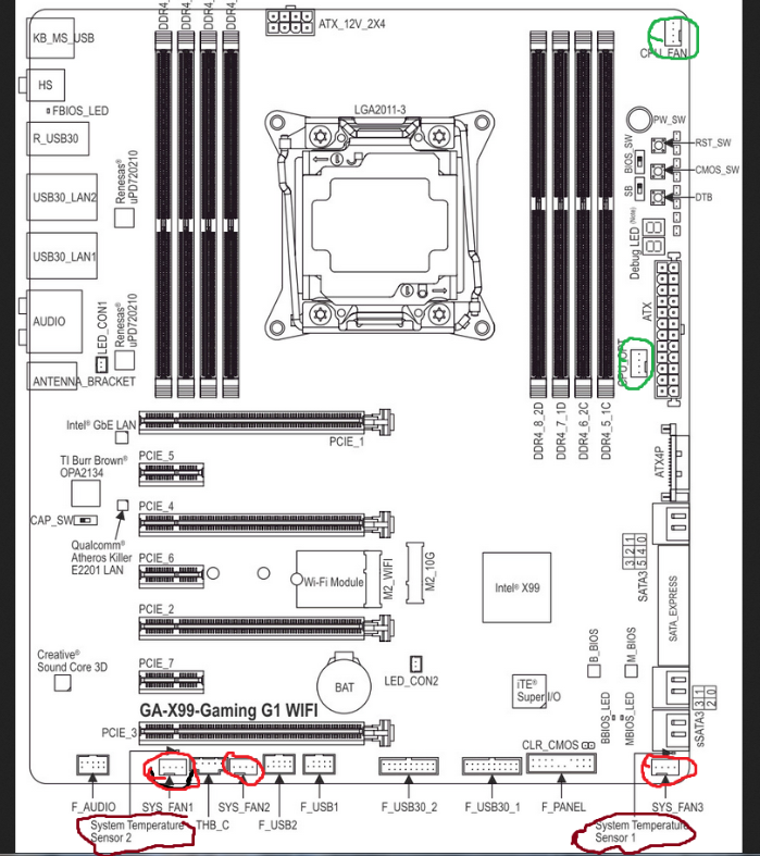 моя плата gigabyte x99 gaming 5 , первая в списке ,на процесоре 2 слота CPU OPTION + CPU Fan , вентиляторы воткнуты в sysfan 2 sysfan 3 в SYS fan 1 "Corsair Vengeance Airflow CMYAF Memory RAM 60mm Fan"