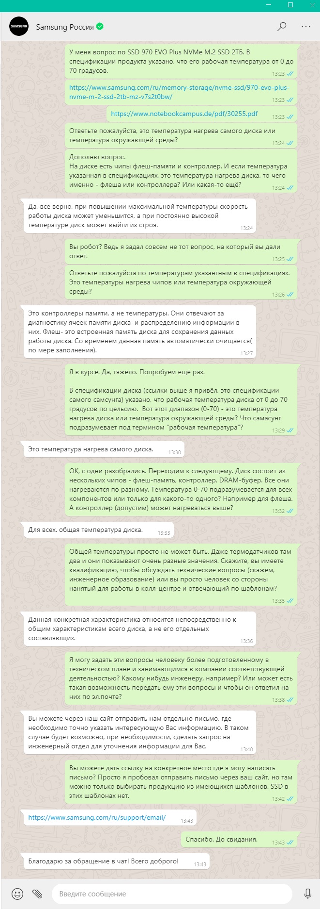 Кстати, ссылку она дала как раз на то место, про которое я ей и указывал, что там вопрос задать просто невозможно. Там выпадающее меню с обязательными ответами (то есть я могу написать вопрос про дисковод, монитор, цифровую рамку или ноутбук), но SSD среди них нет. Или я плохо искал. Так что вопрос про нормы и как их мерить остаётся открытым.