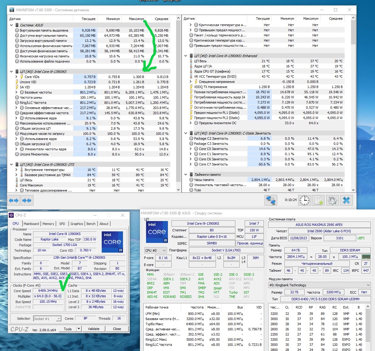 Скрины, да, не ахти (точнее, почти ни о чём). Результатов бенчей цпуз и сб23 не видно (чтобы понять реальный уровень эффективных частот). Но, один плюс я вижу точно. Человек понял про наличие потанцевала свыше его алкорных 5900 (до почти реальных 6400 по ядру, хотя бы даже в простое). И настроил разгон так, чтобы его тоже как-то вытащить для игр и т.п.