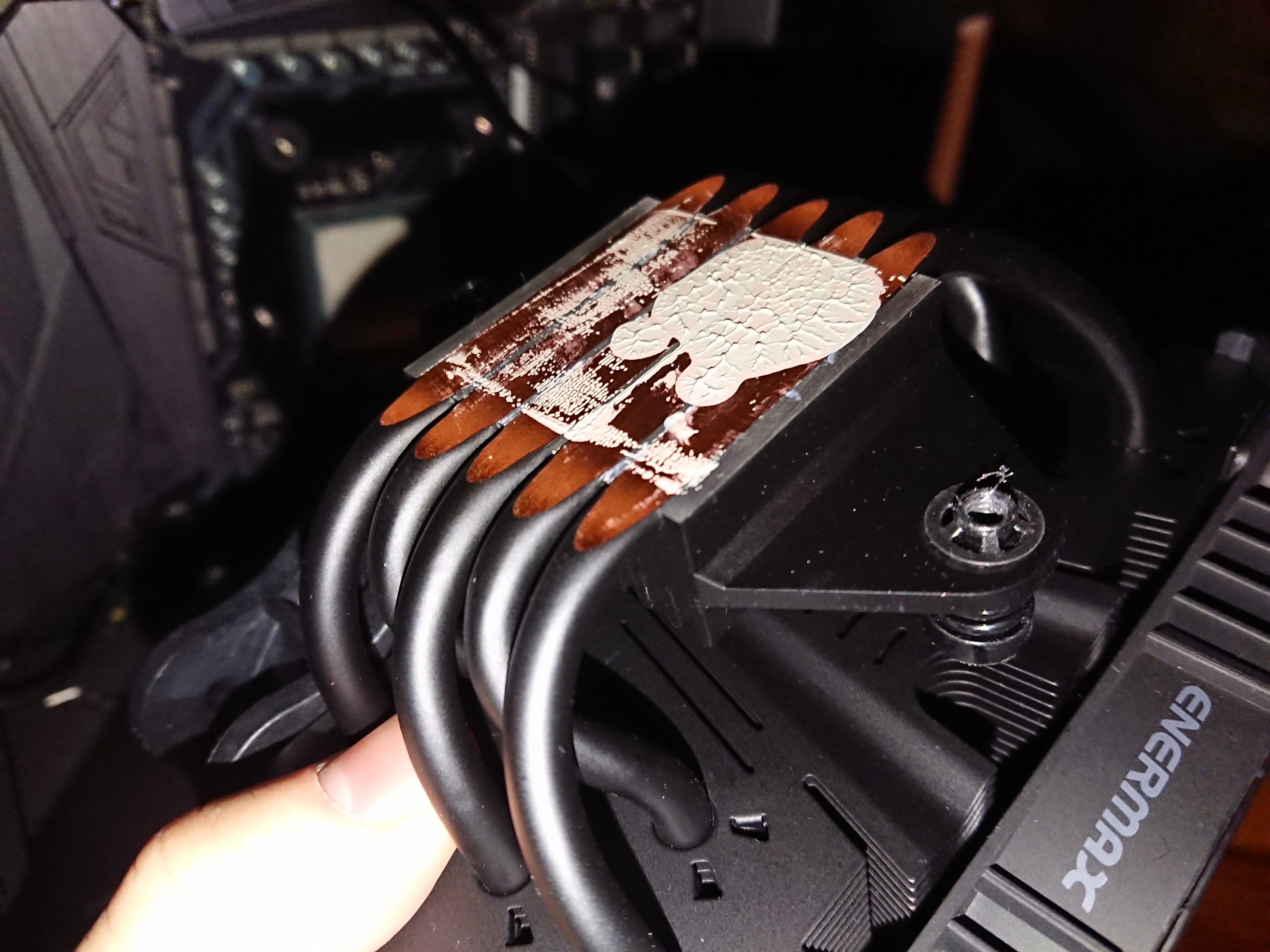 А крышку проца проверяли линейкой. Бывает что у неё углы приподнятые попадаются. У меня такой же Энермакс и отпечаток на моём 3600 идеальный. А что с температурами в стресс-тестах? В Аиде например с одной галкой на fpu stress?
