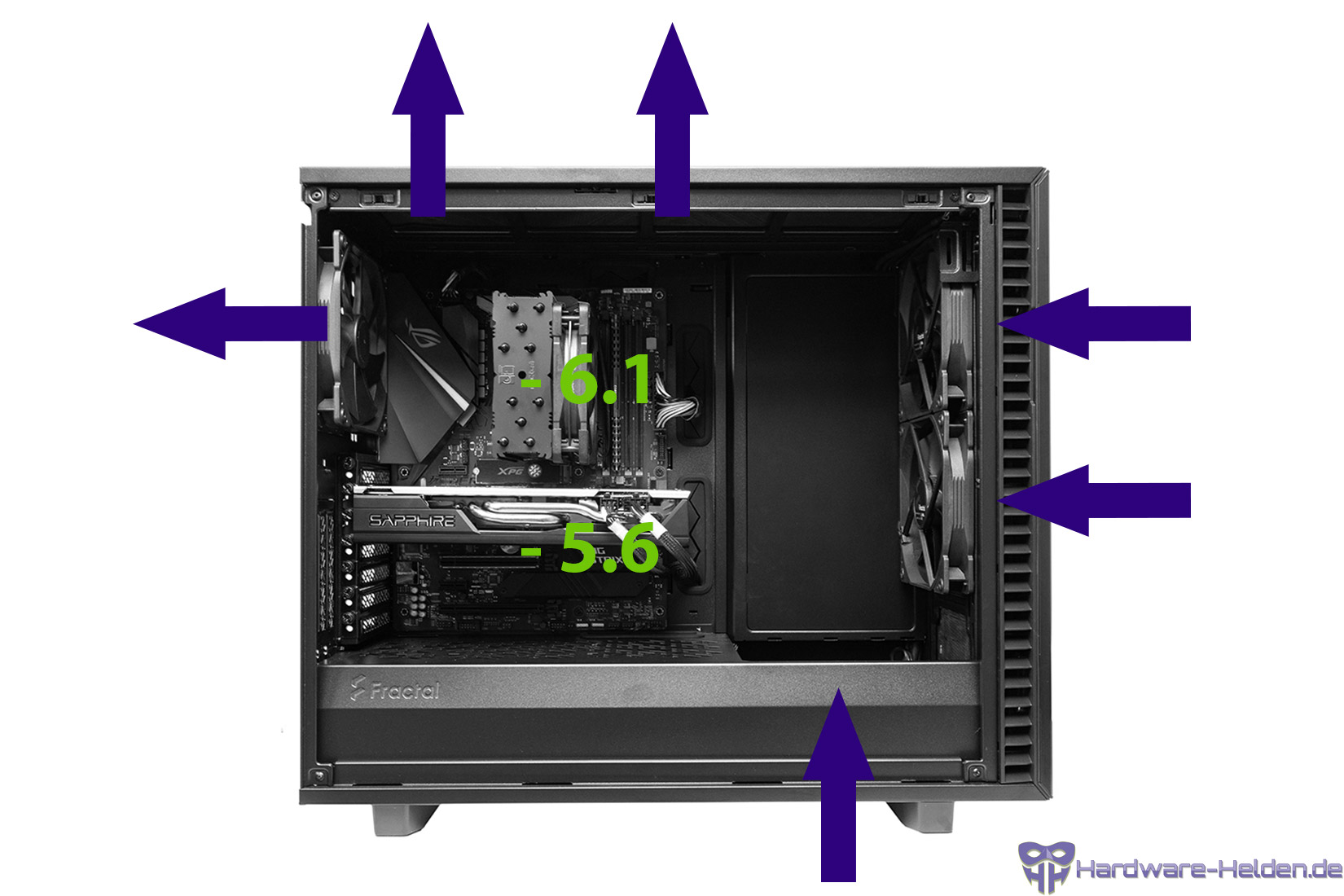 Здравствуйте. Возник вопрос о организации воздушных потоков. Заказал Fractal Design Define 7 XL Dark TG и ЭТО СПАМ - ОТПРАВЬТЕ ЖАЛОБУ (синий квадрат) х63. Водянку буду ставить на выдув вверх, это уже решено и я знаю, что с фронта на вдув будет не много холоднее. В наличии есть 2х Noctua NF-A15 PWM (размер странный у них, но вроде должны влезть) и 2х Cougar CFD series [CF-D14HB]. Думаю вместо двух штатных фронтальных на вдув поставить две нокты, а те что снял с морды переставить вниз (один скорее всего. 2 много будет), а тыловой на выдув заменить кугаровским. Крайне необходим ваш совет в расстановке вертушек. Спасибо за внимание.
