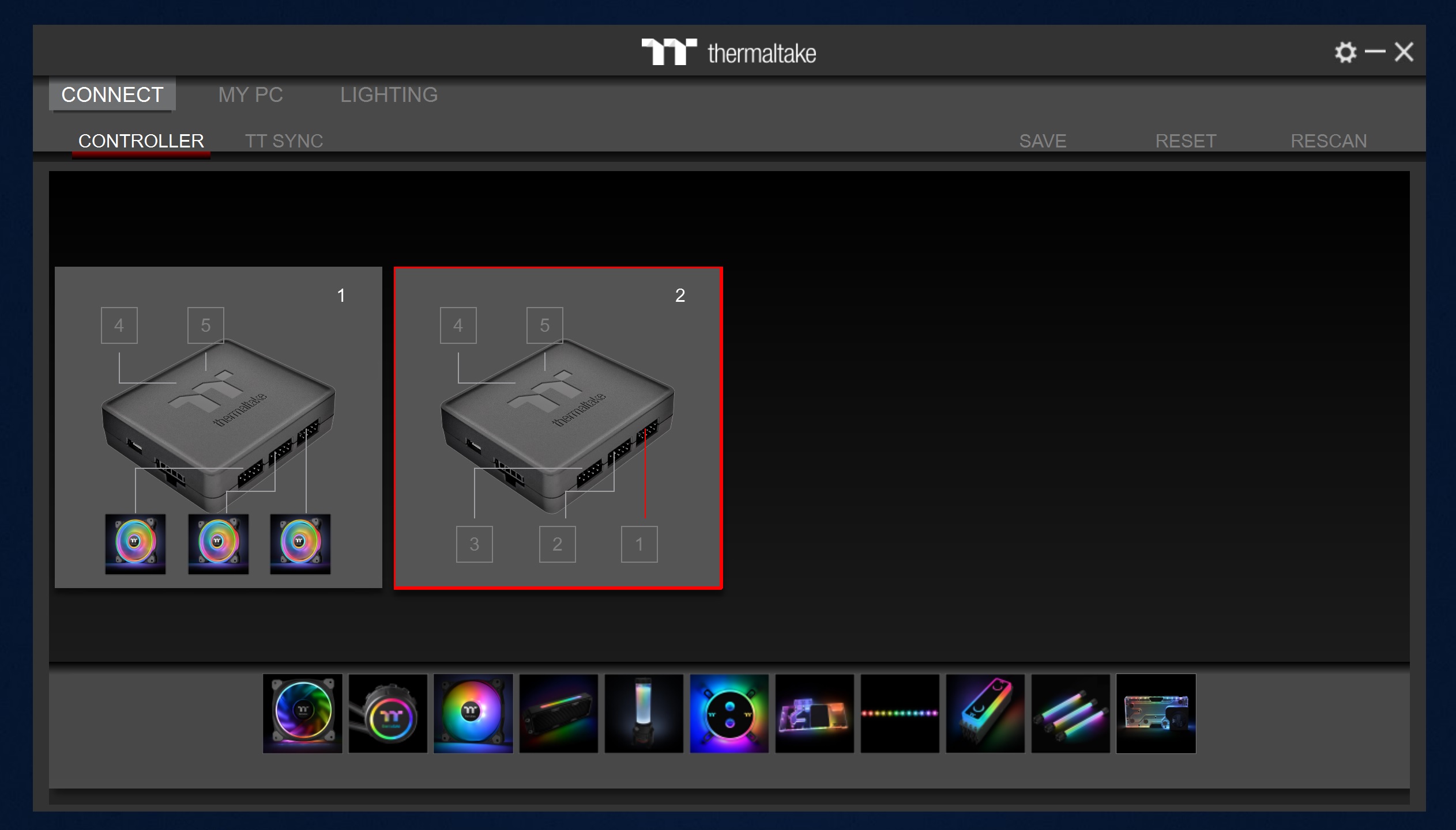 Всех приветствую! Имею 2 комплекта thermaltake riing quad и соответственно 2 контроллера, но почему-то один контроллер в меню выбора вентиляторов не видит thermaltake riing quad, менял местами, не помогло. Куда копать?