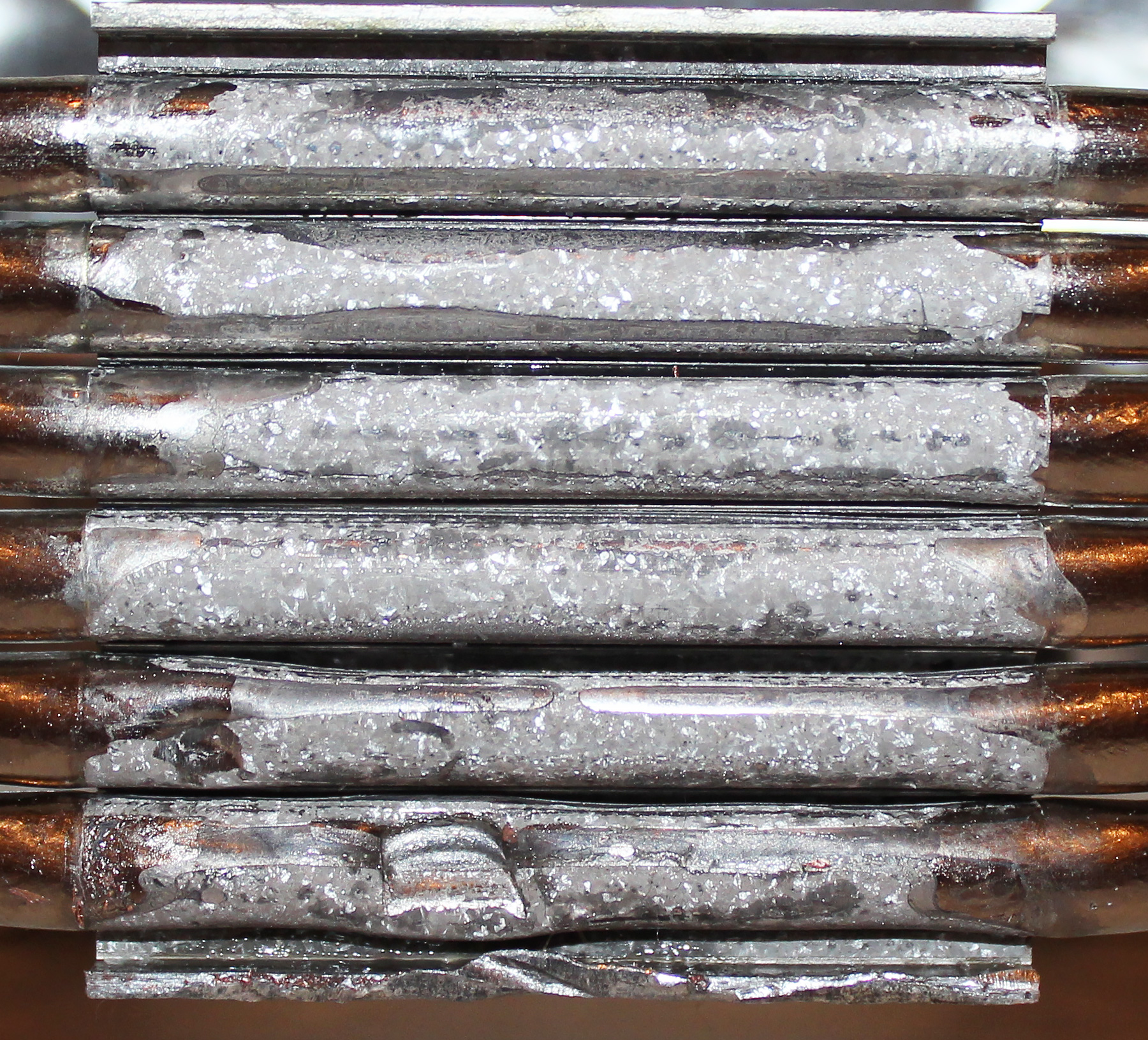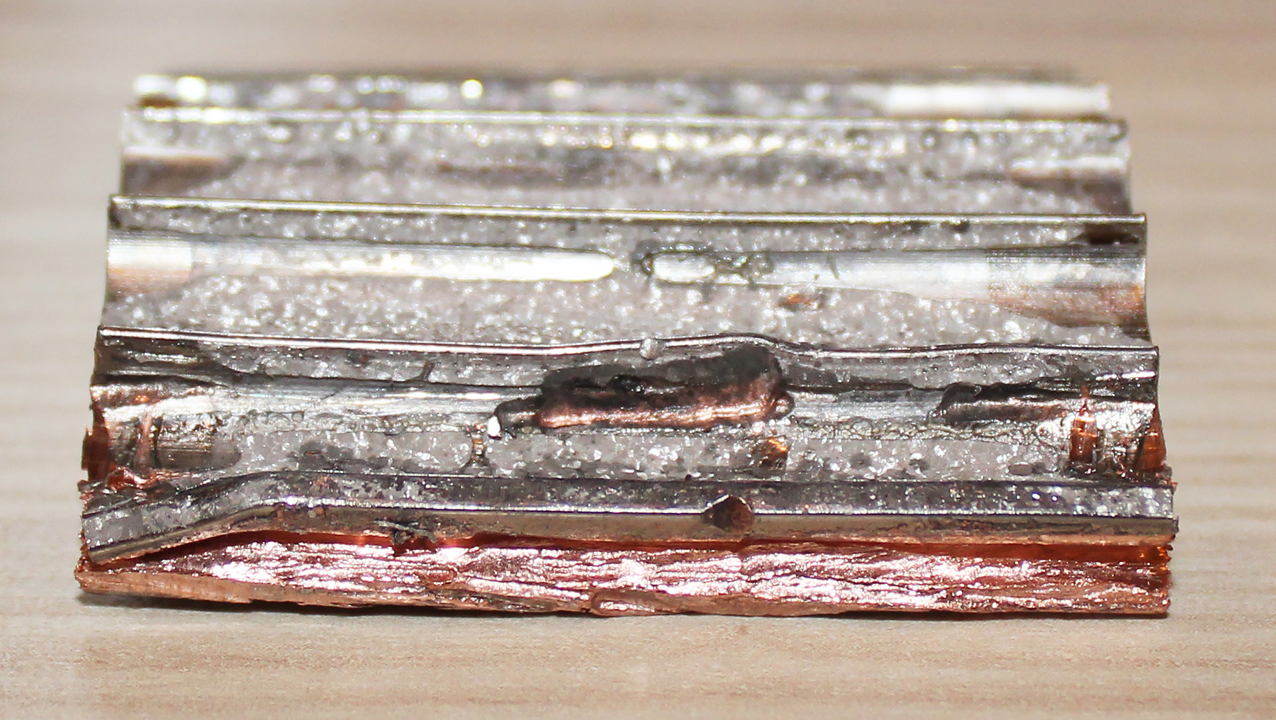 Комментарии: 1) везде пайка, причём довольно качественная пропусков практически нет. Всё сделано здорово; 2) конструкция настолько крепкая, что пришлось использовать зубило, молоток, отвёртку и ножовку. На разборку ушло минут 40, не меньше. Даже трубки согнулись (замятия – это мои кривые руки, а греть нечем было); 3) основание медное на 100%. Это и по цвету металла видно и по его мягкости. Ну может, конечно, с примесями, но тут я не химик.