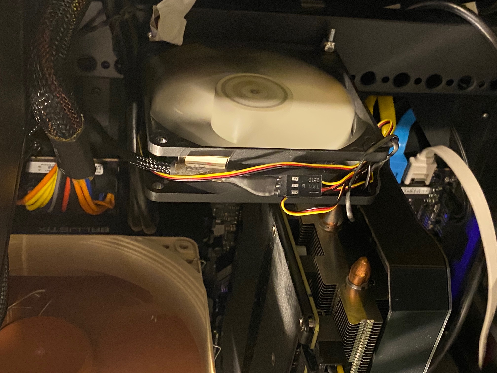 Установил на стенку корпуса кулер на магниты через втулки, для лучшего охлаждения М2 и заодно видеокарты, т.к. больше дует на неё , 140мм не поместился, поэтому установил 120х120х25мм, температура М2 снизилась примерно на 10 градусов (простой/нагрузка), ещё тестируется. Магнит диам.15мм толщ.5мм сила сцепления очень велика, лучше подложить чего-нибудь потолще, чтобы уменьшить силу сцепления, и передвигать по стенке корпуса будет легче. https://postimg.cc/gallery/DZ4S6jc