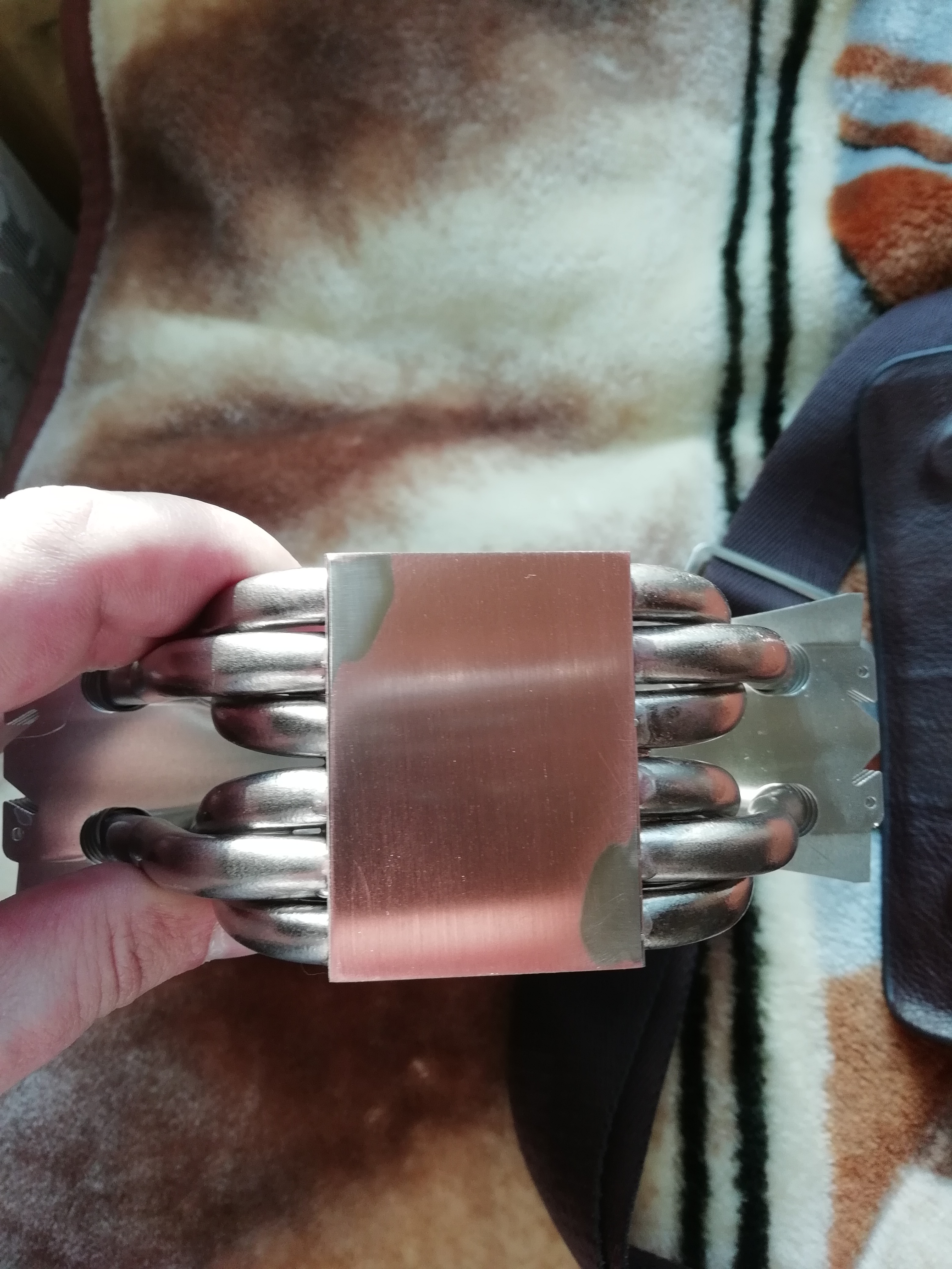 В итоге заказал себе набор крепления THERMALRIGHT для разъема AM4 тип A (AM4_TYPE_A), точно такой же идет в комплекте с TS140P, так на всякий взял, вдруг когда нибудь продавать его владельцам intel или соберу еще ПК на другой платформе. Далее немного из процесса и сам результат шлифовки подошвы TS140P, Она жесть какая кривая была, около 1 мм. С батей делали удаление горбы. Он же подкинул идею снять горб и сделать финальную зачистку авто шкурками для шпаклевки. Основное убирал 400й (2 листа, но лучше брать три четыре, конечно в зависимости кривизны подошвы, у меня на 1мм гдето выпирала), в конце 800 (убирал более глубокие борозды), финальная зачистка была сделана 1200м и 200м листами шкурки. Финишная обработка войлочным диском с пастой гойя (на шлифовальной машинке). На первом фото, где чуть меньше половины бугра сняли, ушёл только 1 лист 400й и 1н 800й, на следующем, где две большие точки никеля по краям (это углубления) пришлось ровнять все, использовал 400й, 800й, и 1200й листы наждачки. До фанатизма не шлифовал, т.е. в зеркало не превращал, можно было бы еще более зеркально сделать, но смысла не вижу.