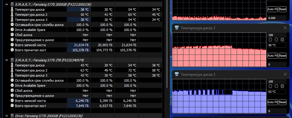 Приветствую. Вопрос назрел с двумя одинаковыми китайскими ссд) Первый (на рисунке он верхний) линии от проца, он системный и заполнен на 15% примерно. Второй (на рисунке снизу) линии от чипсета, файлопомойка, заполнен на 75% примерно. Отличаются они версиями прошивки только на первом 3.W.J.0, на втором 3.W.J.1, более свежая. И нагревом, в простое первый 46 градусов, второй 56, то есть существенно вроде. В тестах максимальную температуру контроллера видно на фото (1-65, 2-72) Охлаждение у обоих одинаковое, как и прижим. Вопрос: Это просто рандом такой у Китайцев или все таки контроллер чудит? Или это может вообще материнская плата снимает показатели криво (на фото видно как температура на контроллере прыгает с 55 до 72 градусов)?