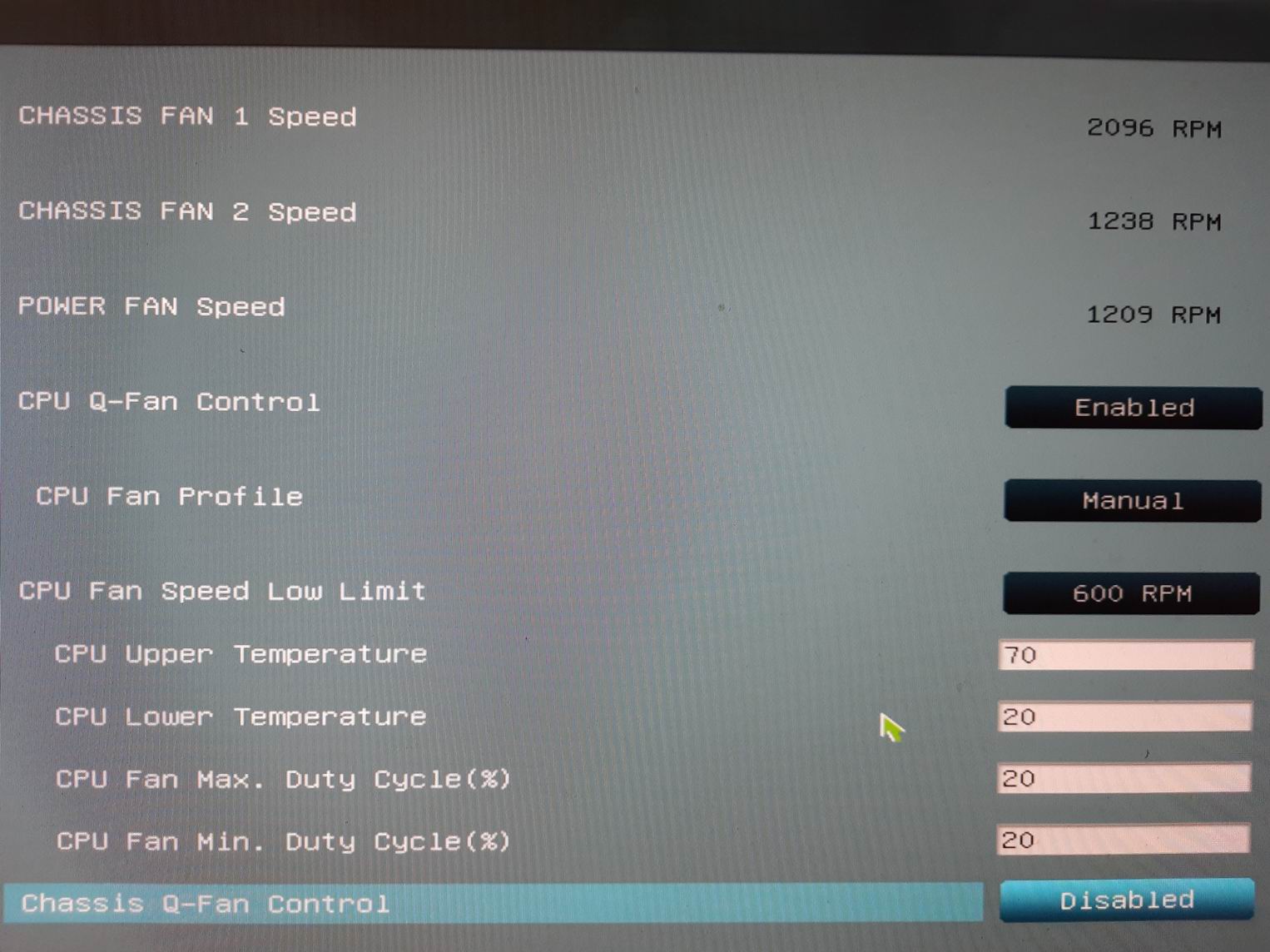 сконфигурировать это означает поставить программу Thermal Radar с сайта Аsus, выбрать режим manual и настроить зависимость оборотов от температуры так как нужно Вам. График оборотов нарисовать какой надо. Но так как Вы эту программу не использовали никогда, то сложно объяснять на пальцах, что бывают настройки помимо готовых профилей. И не только в BIOS. Manual это тот самый профиль, который вручную нужно настраивать самому.