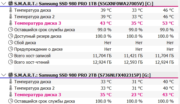 Летом 23 года был вот такой расклад: Охлаждение M2 SSD #18019817 Оба диска +\- грелись одинаково. Но весной 24 года сменил материнку: