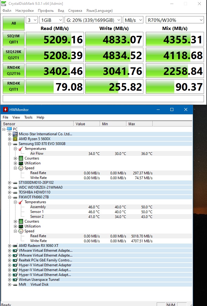 ADATA XPG MARS 980 BLADE 2 TB (является системным диском, работает в режиме PCI-E 5.0): от 32 до 37 градусов по первому датчику, от 51 до 64 градуса по второму. На нём установлен добротный радиатор материнской платы M.2 Shield Frozr (https://ru.msi.com/Motherboard/PRO-Z890-P-WIFI/Overview);