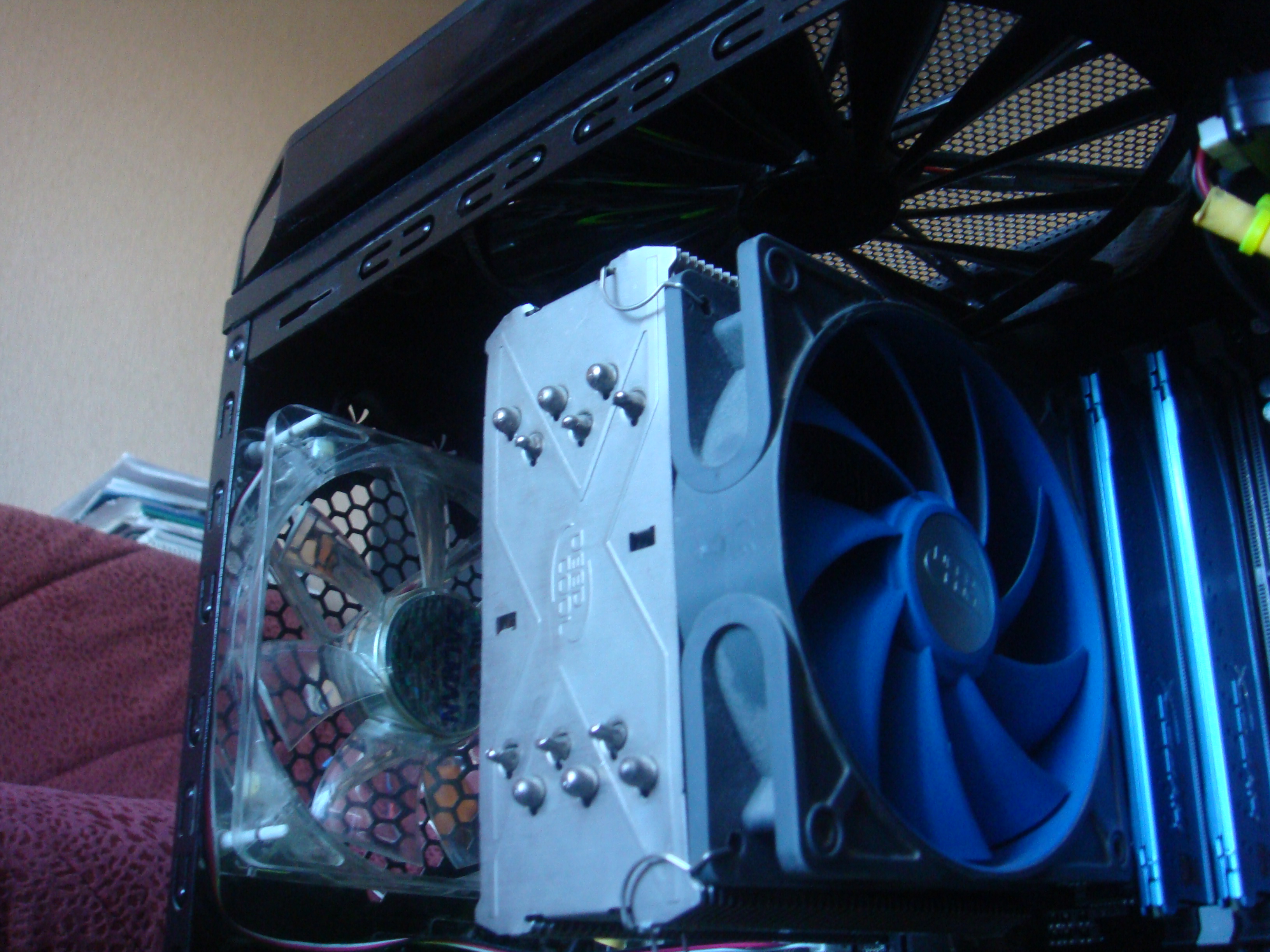 Я снял вентилятор с радиатора ЦП и повесил на боковую крышку(на вдув)