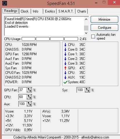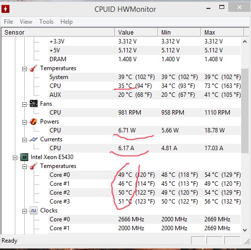 Помогите разобраться с датчиками Где здесь правда? на Speedfan ядра ~35 как и Cpu HWMonitor показывает совсем другое, Cpu 35 ядра 50, так же показывает Rivatuner Что это за ерунда