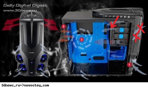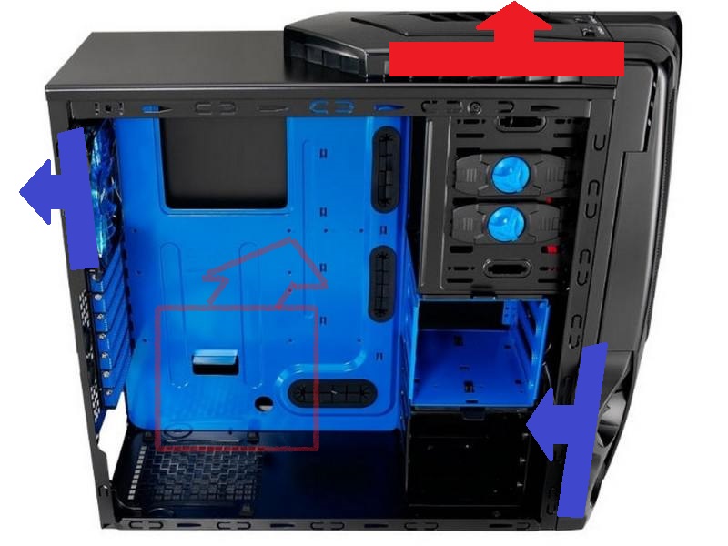 разработчики не очень задумывались о проблеме перегрева железа и правильном охлаждении, по-этому прошу помощи у вас с завода стояло 2 кулера, пометил их синим цветом 140мм спереди и 120мм сзади, маленькие "турбинки" спереди просто элемент декора еще 2 вентилятора по 120мм поставил я - сверху под "воздухозаборником" и на боковой крышке - для понятности они красным цветом сейчас в закрытом состоянии видюха греется 80+С, а с открытой крышкой 70-75С для справки: стоит обычный небольшой кулер на цпу, гпу HD7950, в съемном боксе для жестких дисков стоят SSD и HDD как правильно расположить их, чтобы достичь максимально эффективной вентиляции? заранее спасибо