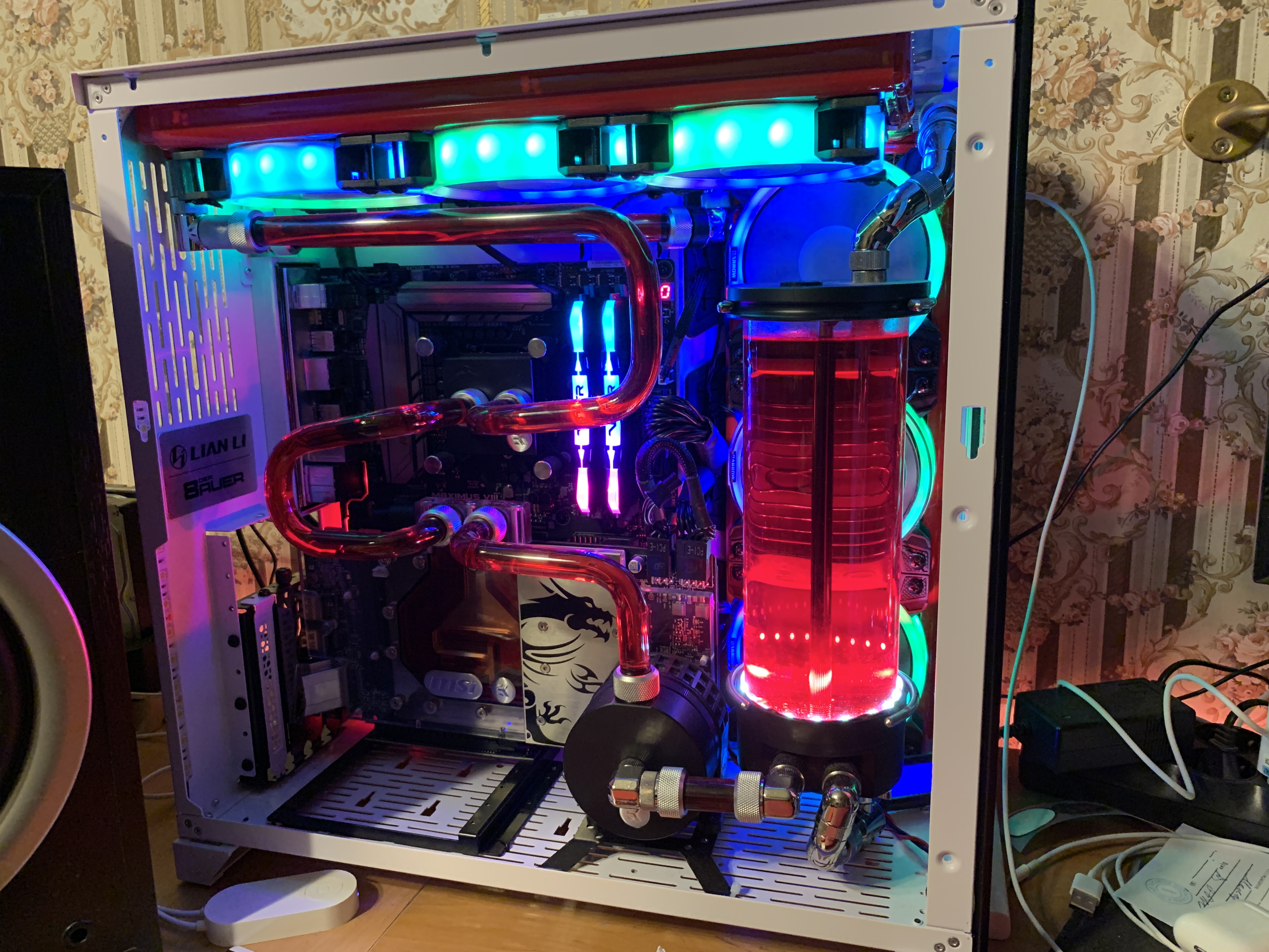TOTALNOGEBAT опыт с водой был, фото ниже, но на примере данного корпуса я для себя решил что для воды требуется открытый стэнд (P5 и ему подобные). Почему такой вывод: если крышку закрыть то внутри начинается баня ибо нет свежего воздуха для продува радиаторов(хоть на фото нет вентиляторов снизу, но я пробовал их туда ставить - результат такой же). Касаемо температур: при комнатной 25 градусов - жижа в тяжелых игрушках прогревалась до 40 градусов что не есть хорошо, при этом карта грелась до 55 градусов, в то же время температура материнки была ~42, при этом вентиляторы приходилось раскручивать до 1200 оборотов, что уже не комфортно. Так себе результаты, в общем. А в открытом же виде жижу не видел выше 35 градусов, при этом вентили крутились на 600. Фото сборки: