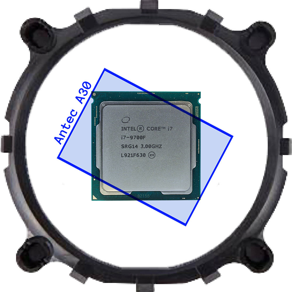 Коллеги! Собираю новую систему. МB Gigabyte Z390 Gaming X, CPU i7-9700f, кулер Antec A30 Процессорный кулер ранее стоял на MB Asus Z170 Pro Gaming и прекрасно себя чувствовал, ставь его хоть вдоль, хоть поперек. Мать Gigabyte я купил первый раз и с удивлением обнаружил, что этот кулер можно установить только креативно, то есть криво, примерно так: