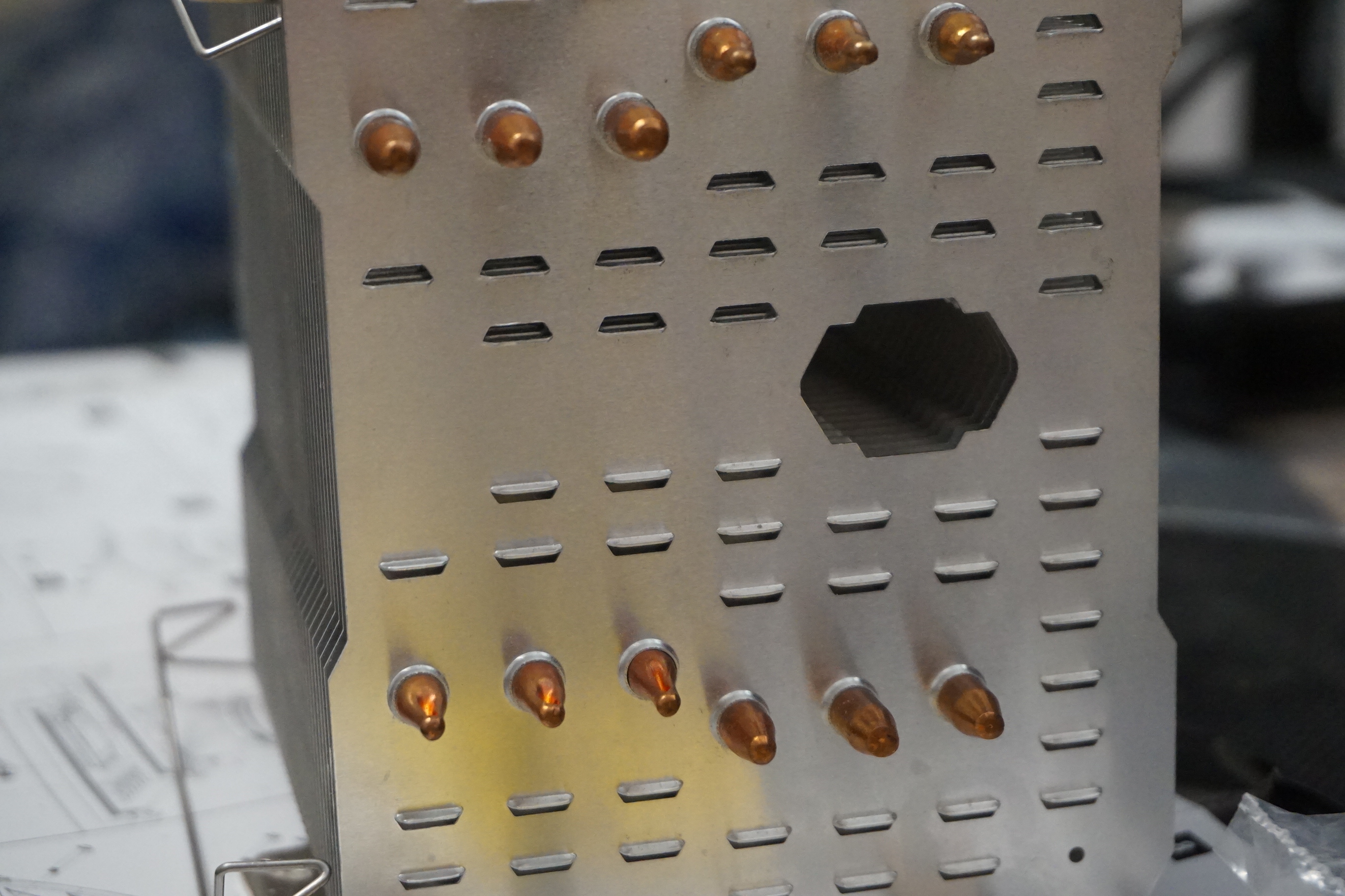 Прямоточное воздушное охлаждение, крышка процессора установлена. Думаю крышку лучше снять. В продаже отсутствуют компьютерные воздушные компрессоры, пробовал дуть обычным но струя воздуха в моем компрессоре неравномерна. Также можно охлаждать до −140 °C — температура, при которой воздух сжижается, переходя из газообразного состояния в жидкое, при давлении 58 атмосфер.