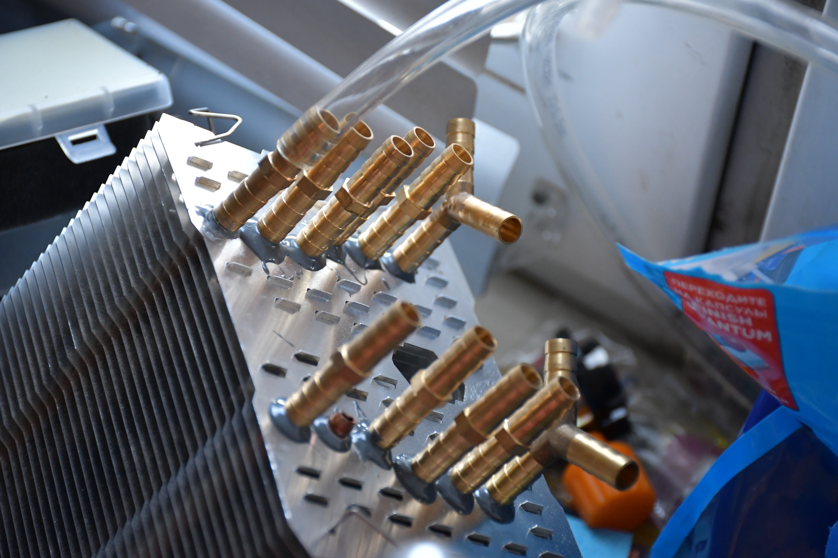 Планирую обрезать часть трубок радиатора, соединив их пластиковым шлангом в единый контур, и подключить помпу точно такую как на видео.