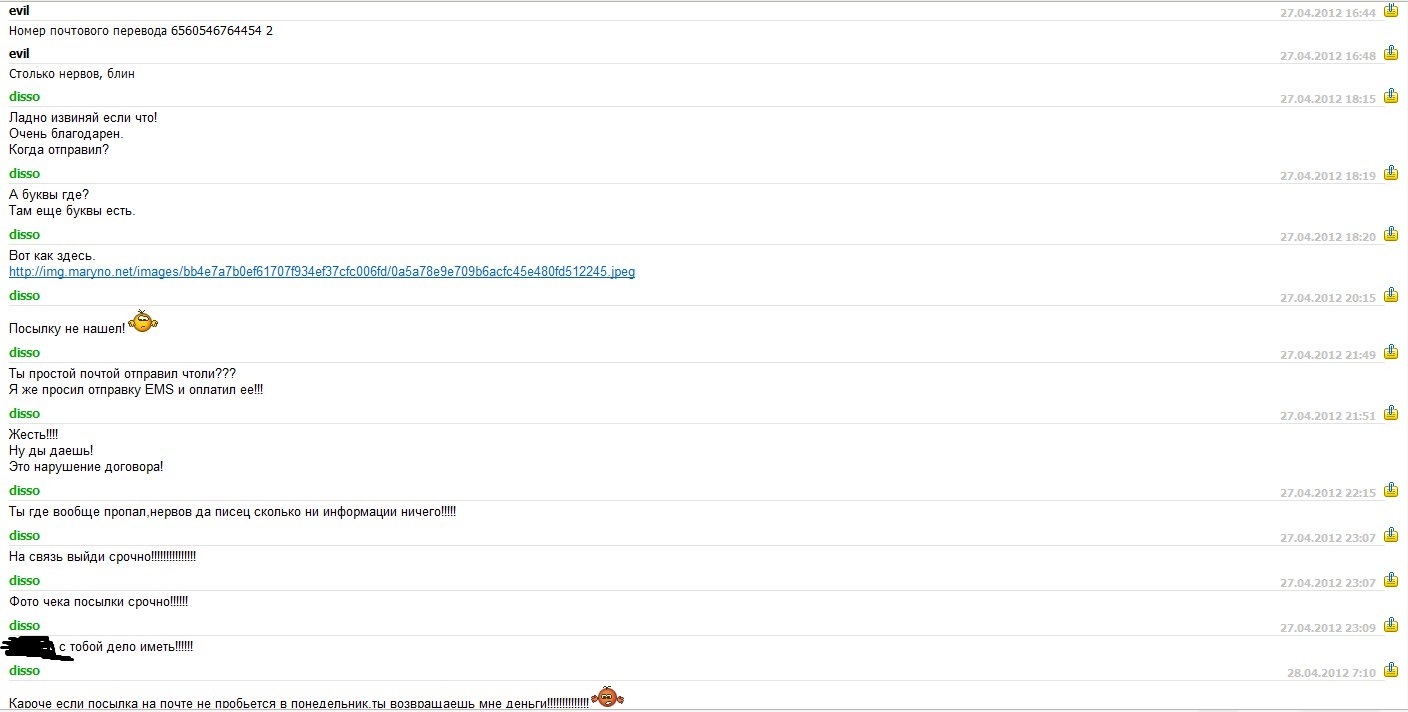 Нашёлся новый кидала - не знаю как он зарегистрирован здесь, но вот его ICQ 610906727 (ник evil, Иван Орлов), написал мне в аську и предложил роутер. Перевёл ему деньги на Yandex.деньги 410011388602518 (email - po4taorlov@yandex.ru) и он прислал мне трекер для отслеживания посылки (62503267644542). Трекер не отслеживается, он в начале отвечал мне по аське, мол подожди я всё отправил и теперь вообще перестал отвечать. Судя по трекеру проживает он в г. Тюмени. Помогите найти. Спрашивал его сотовый, но он под различными предлогами не давал его. Скан чека об отправке так же не прислал, хотя обещал. Сослался на занятостью.