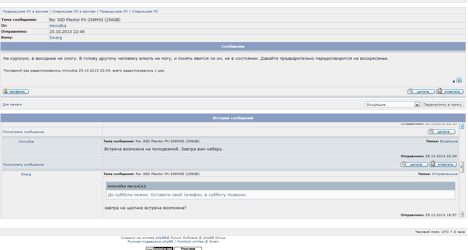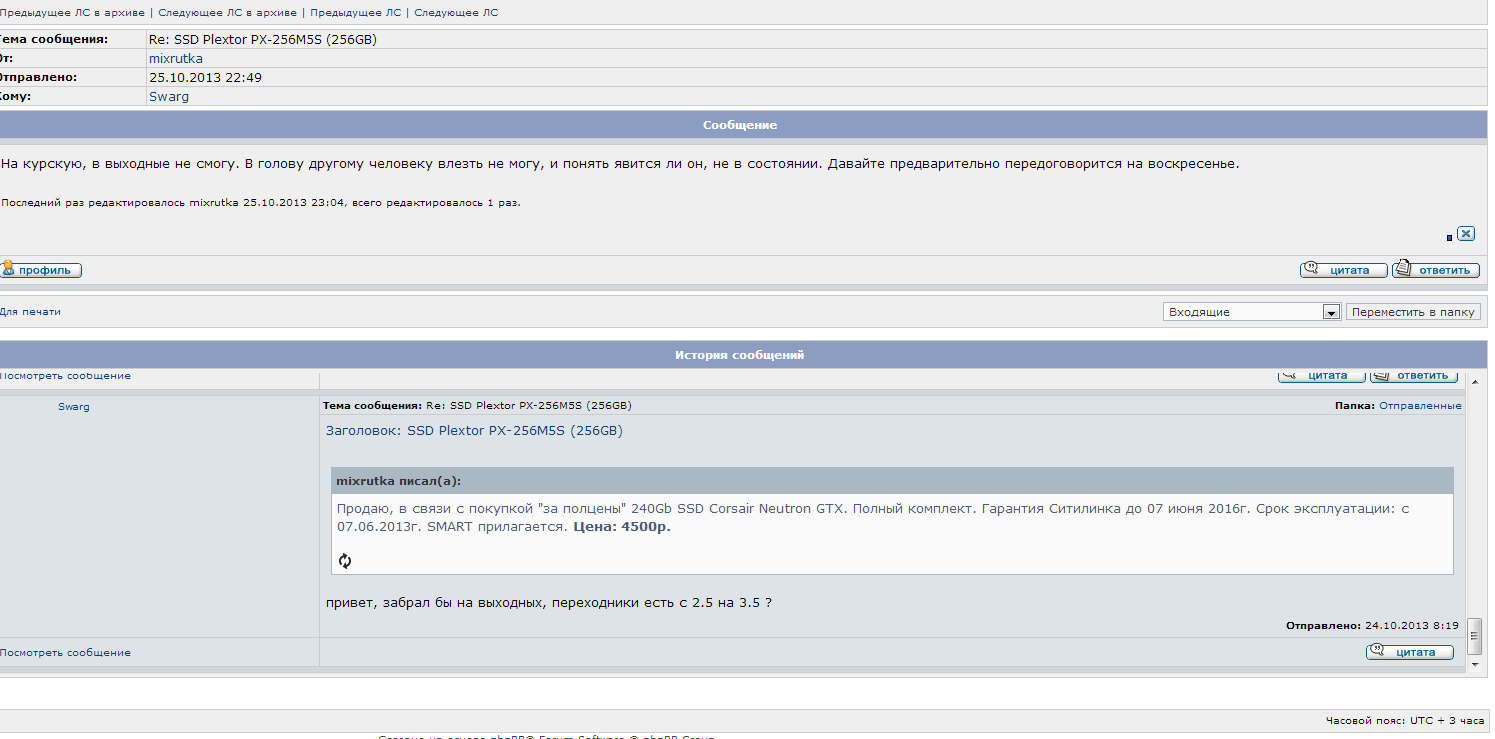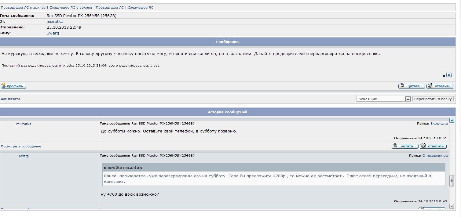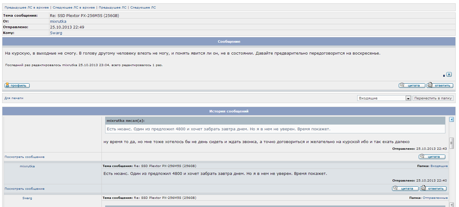 Swarg, mixrutka, у модераторов нет никакой возможности прочитать ваши ЛС. У админа прямой возможности тоже нет. Так что если есть взаимное согласие, можете выложить переписку в виде скриншотов (хоть оба выкладывайте). Правда не вижу в этой ситуации такой проблемы, которую имело бы смысл обсасывать так долго в "отзывах и благодарностях".