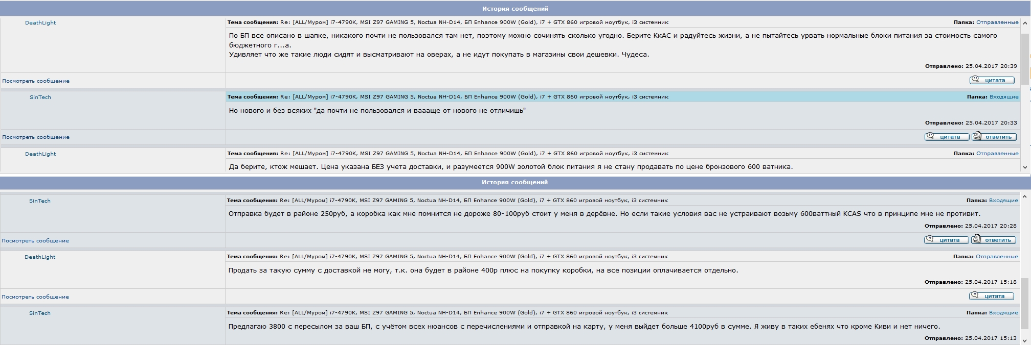 Нравятся мне такие "плаксы" (а конкретно SinTech), которые даже ПОЛНУЮ переписку не могут предоставить, наверное потому что любят вытягивать все из контекста, дабы не выглядеть очерненным на остальном фоне. И да, я не вижу никакой грубости в своем ответе, грубо Вы бы услышали отправив еще с пяток подобных последним сообщений мне в ЛС. Полный вариант: http://images.vfl.ru/ii/1493217219/34ae ... 007603.jpg Человеку было ясно сказано, сколько стоит данная позиция, и что продавать за его предложенную сумму не собираюсь. Видимо его расстроило то, что товар из дорогого сегмента не продали по цене, именно, магазиной дешевки.