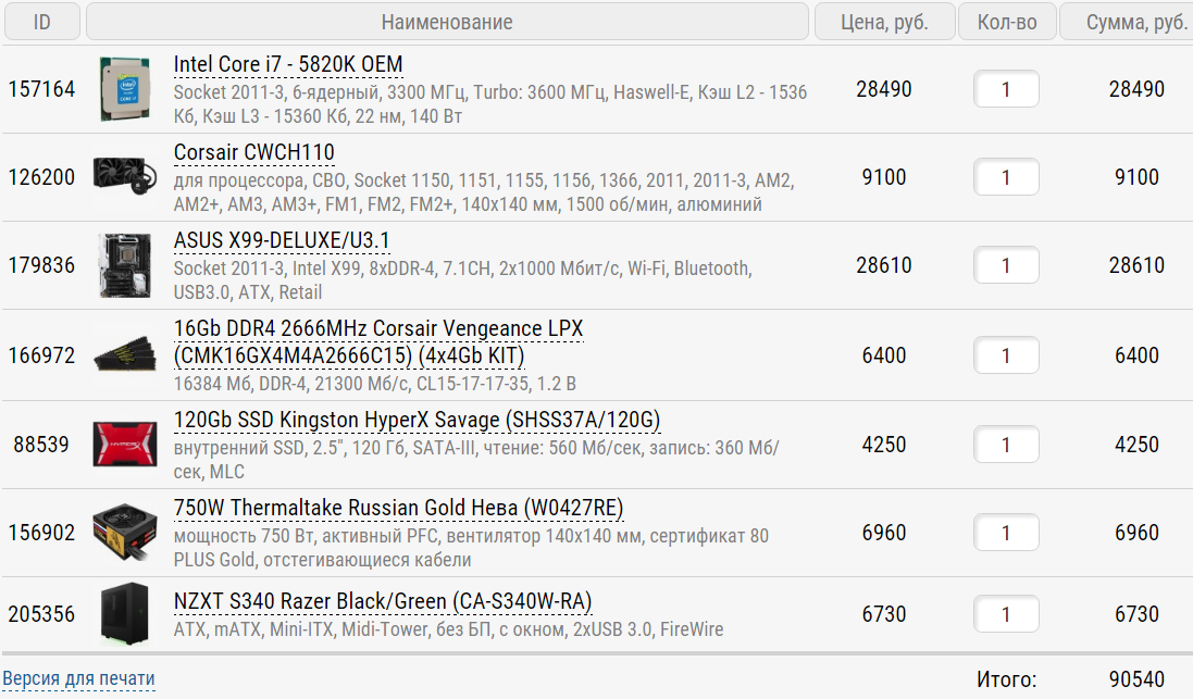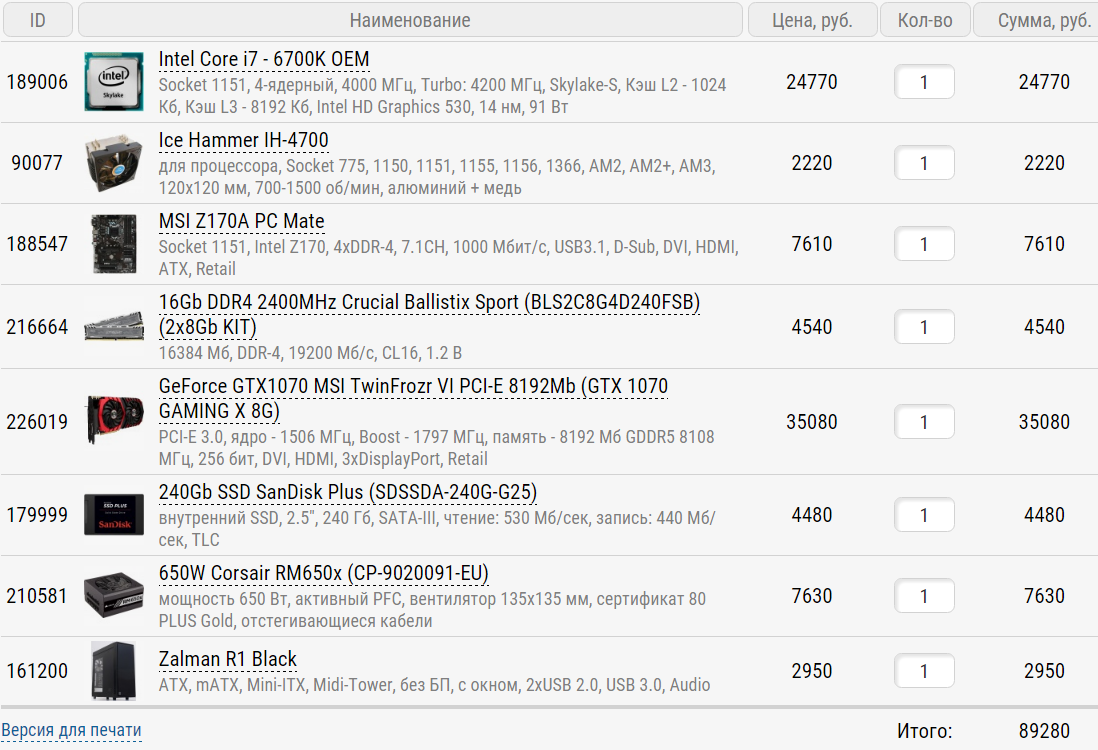 Если этой игровой домашний комп (Ветка выбора компьютера до 120.000 рублей. #4743466 - что, где и с какой целью покупается?), то слабые места такие: БП - может быть шумноват в нагрузке, хотя с точки зрения большинства пользователей ОК. Оперативка - берите 2x8Gb Samsung/Hynix, более дорогая память с частотой ниже 2800Mhz банально хуже + понятно, еще и дороже; 16Gb хватает с огромным запасом на все игры, если через пять лет понадобитс еще память - просто докупите (заплатив меньше, чем сейчас). Кулер избыточен (а при данном БП абсолютно бессмыслен), если есть что-то дешевле из рекомендуемых, то можно не переплачивать. ССД дорогой, лучше за эти деньги взять на 480-512Gb или дешевле взять что-нибудь типа OCZ Trion 150 или Kingston UV300. Видеокарта дороговата (или у вас там на все 1070 такие цены?).