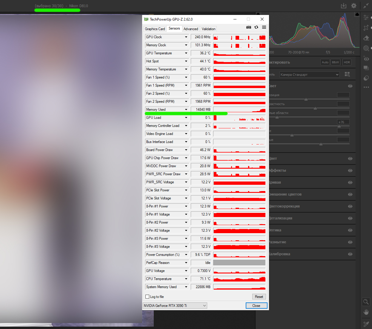 Конвертация 30 равов (просто для примера, у меня съемки и обработка по 1000-1500 кадров), занято почти 14гб видеопамяти, использование видеокарты очень сильно ускоряет сам процесс конвертации и сохранения. Топаз Гигапиксель в версии от 8 и выше, сильно изменили и переписали, он работает как на облаке, (что для пользователей из РФ несколько проблематично), так и на локальных моделях (при установке докачивает почти 11-14Гб), так вот он в работе грузит все cuda ядра на 100%, чем их больше тем быстрее идет обсчет картинки и насыщение ее деталями. И это только часть примеров.