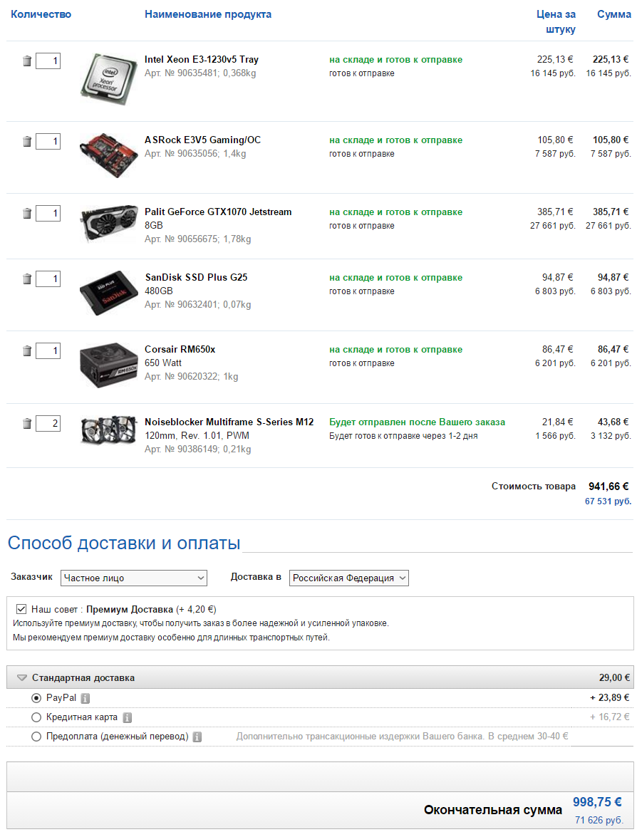 998,75 € или 71 626 руб. если PayPal + Премиум Доставка