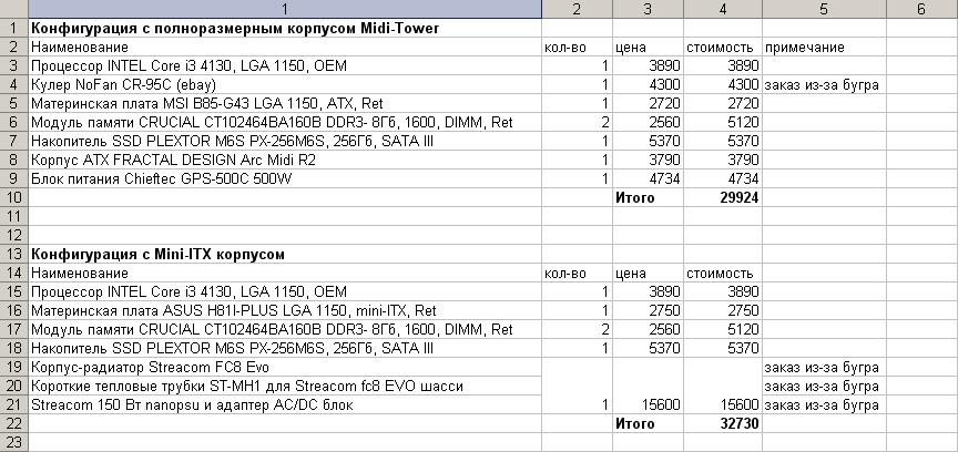 На данный момент имею вот такую конфигурацию: Процессор AMD A6-6400K BOX (AD640KOKHLBOX) Материнская плата ASRock FM2A88X-ITX+ Оперативная память Kingston ValueRam 2GB DDR3 PC-12800 - 2 планки SSD Silicon-Power Slim S55 60GB Блок питания Corsair VS550 550W